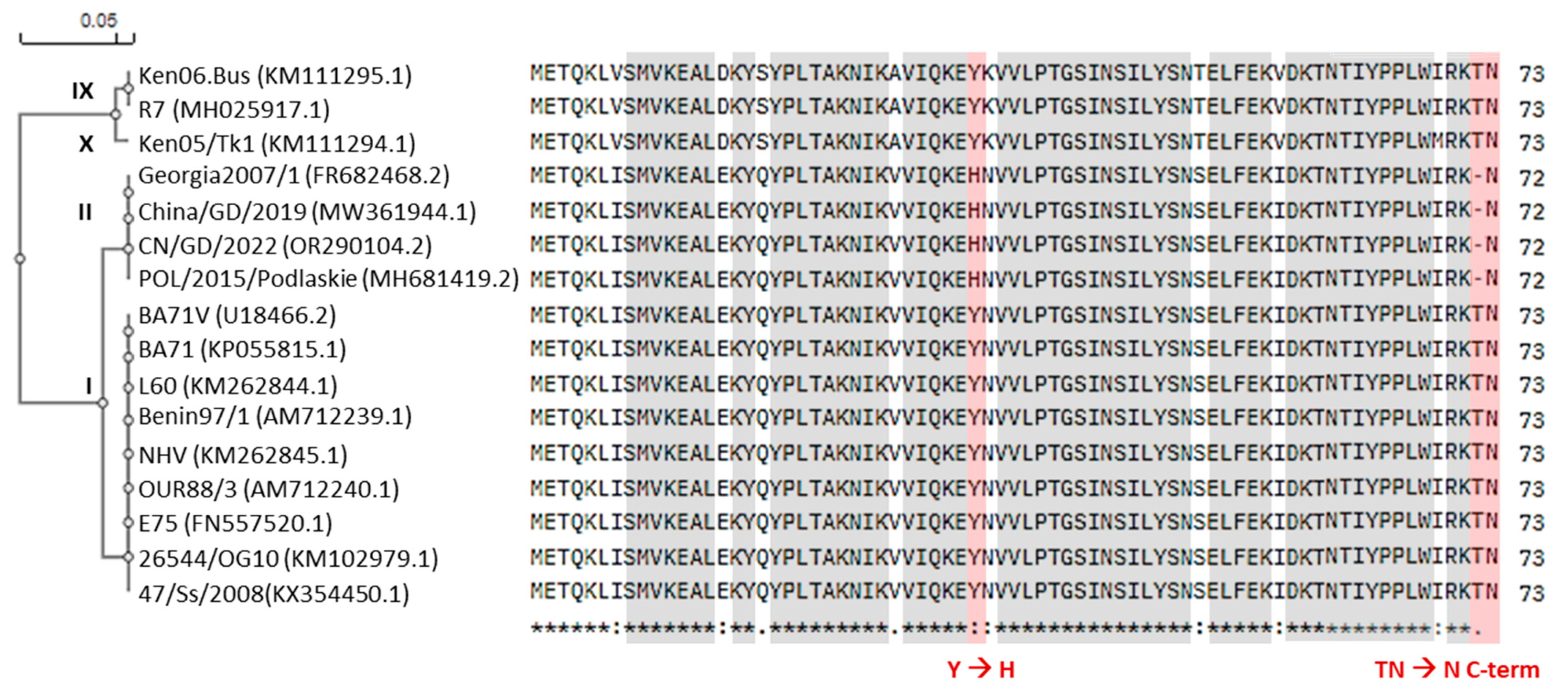 Figure 3. Alignment of pI73R sequences across different ASFV genotypes, highlighting conserved and variable regions. The consensus line below the alignment indicates identical residues (*), strongly conserved substitutions (:), and weakly conserved substitutions (.). Unique amino acid changes between the ASFV genotype II I73R sequence and the sequences from genotypes I, IX, and X are highlighted in red. Amino acid sequences were obtained from the NCBI GenBank database. Corresponding accession numbers are indicated.