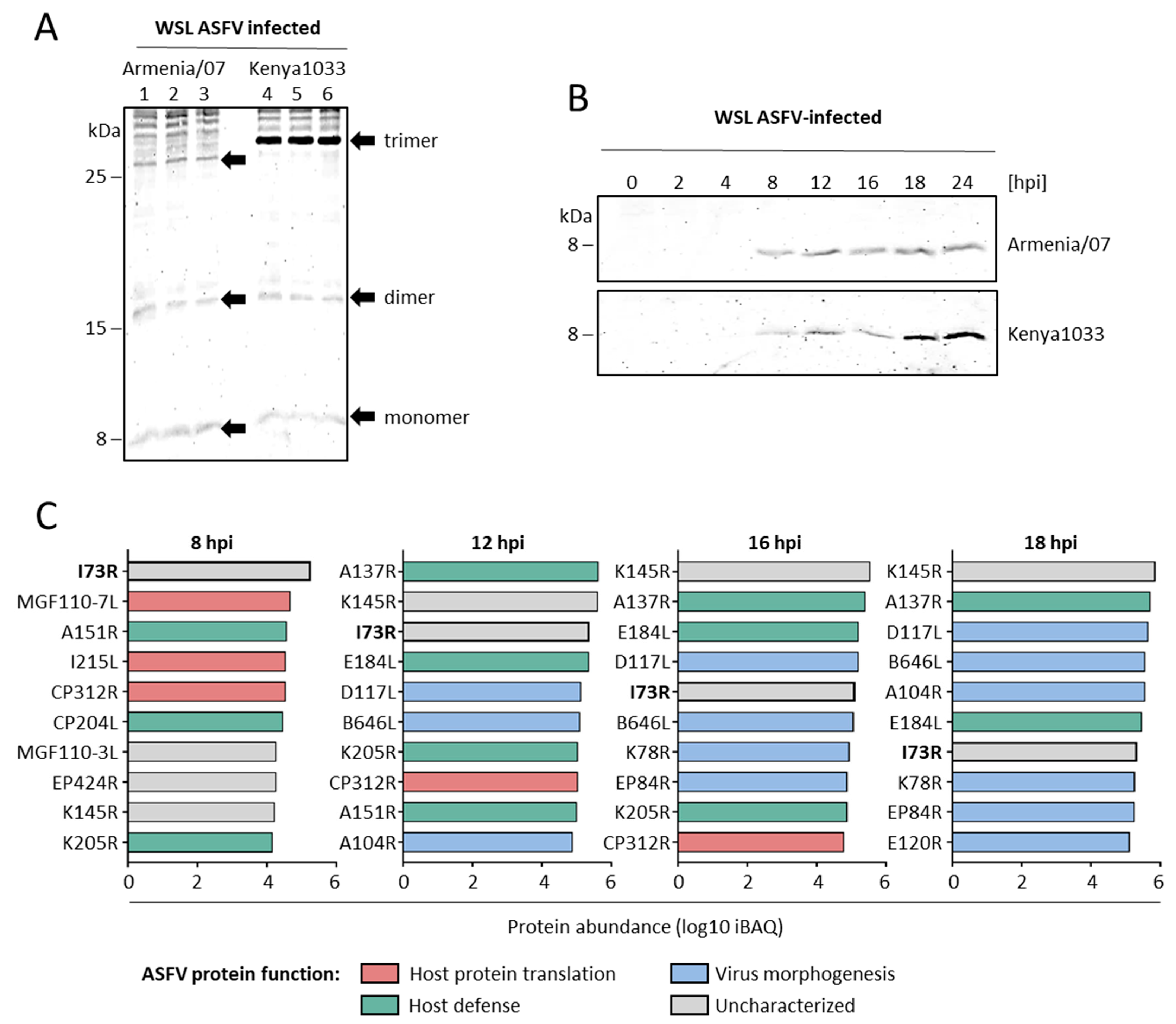 Figure 5. Characterization of pI73R oligomerization and expression profile. (A) Immunoblot analysis depicting the formation of pI73R oligomers in WSL cells infected with ASFV Armenia/07 (genotype II; triplicates 1–3) and Kenya1033 (genotype IX; triplicates 4–6) at an MOI of 1 PFU/mL for 24 h. (B) Time-course immunoblot analysis of pI73R expression in WSL cells infected with ASFV Armenia/07 and Kenya1033 at an MOI of 1 PFU/mL, with samples collected at 0, 2, 4, 8, 12, 16, 18 and 24 h post-infection (Table S3). (C) Top 10 most abundant ASFV proteins ranked according to their expression levels determined by quantitative MS at the indicated times postinfection. Proteins were categorized based on their functional roles during infection.