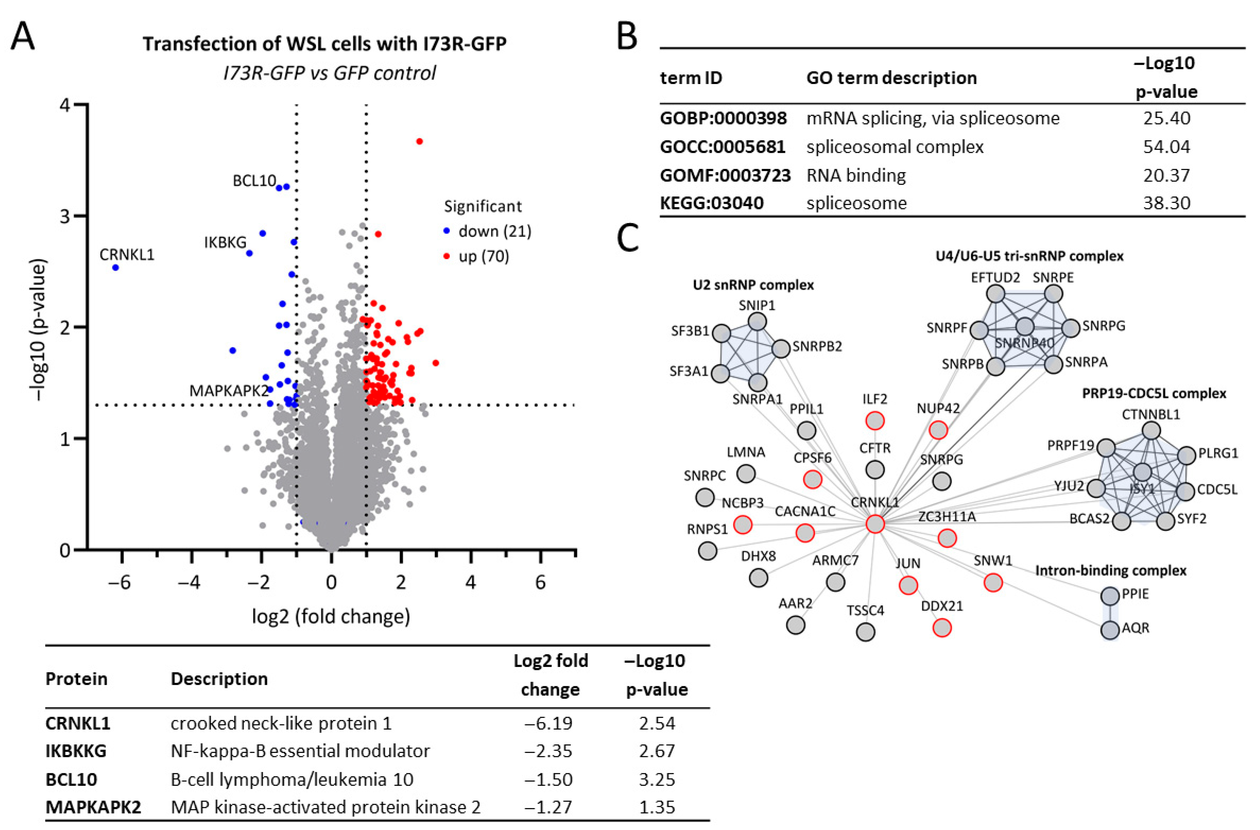 To investigate the functional role of pI73R in regulating cellular processes, we analyzed changes in the cell proteome profile resulting from its overexpression. WSL cells were transfected with either an pI73R-GFP or a GFP construct as a control. After 24 h, cell lysates were collected from three independent replicates. Proteins were extracted and digested into peptides, which were then analyzed via MS for proteomic identification. The analysis identified a total of 4629 proteins (Table S4), with 70 proteins significantly upregulated and 21 proteins downregulated in response to pI73R overexpression (Figure 6A). Among the downregulated proteins, CRNKL1 showed the most significant decrease, with a log2 fold change of −6.2. Additionally, the expression of pI73R led to a downregulation of several proteins involved in innate immune responses, including B-cell lymphoma/leukemia 10 (BCL10) and NF-kappa-B essential modulator (IκBKG or NEMO), which are key regulators of NF-κB signaling, as well as MAP kinase-activated protein kinase 2 (MAPKAPK2), a component of the MAPK14/p38α signaling pathway. To gather insights into the cellular function of CRNKL1, we analyzed its protein interaction network using the IntAct [24] online database. A total of 95 experimentally identified interactions between CRNKL1 and human proteins were identified (Table S5). The GO-term and the KEGG pathway enrichment analysis of these interacting proteins was performed using g:Profiler and revealed a significant association of CRNKL1 with the mRNA splicing proteins (Figure 6B, Table S6). CRNKL1 interacts with spliceosomal proteins of U2 and U4/U6-U5 small nuclear RNA (snRNA) complexes, PRP19-CDC5L complex, and the intron binding complex (Figure 6C). Additionally, several CRNKL1-interacting proteins have been reported to enhance or inhibit viral replication (Table S5).
