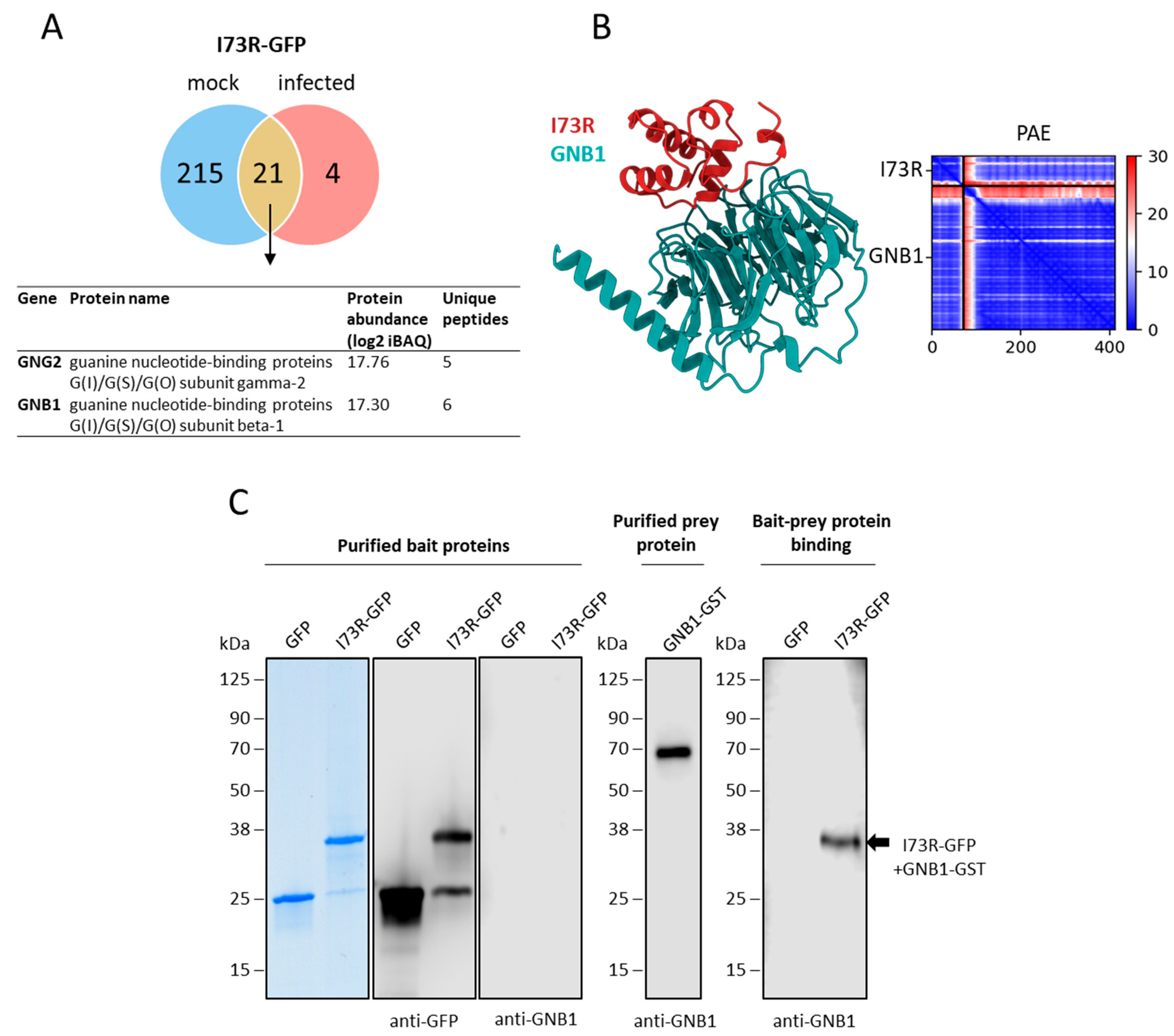 Figure 8. Interaction between pI73R and GNB1. (A) The Venn diagram illustrates the partial overlap of the pI73R interactomes observed in non-infected and ASFV-infected cells. The accompanying table highlights two top high-confidence interactors of pI73R, GNB1, and GNG2, which are common to both conditions. (B) Predicted structure of the pI73R (red) and GNB1 (green) as ribbon representation. Blue areas with low predicted aligned error (PAE) values indicate potential interactions within and between GNB1 and pI73R. (C) Far Western blotting of pI73R-GNB1 complex. GFP-trap purified proteins GFP and GFP-pI73R were separated by SDS-PAGE and transferred onto nitrocellulose membranes. The membrane was incubated with purified GNB1-GST. After washing, bound protein was detected with a GNB1 antibody. The arrow points to a distinct band corresponding to the pI73R-GFP protein indicating specific binding to the GNB1-GST protein.