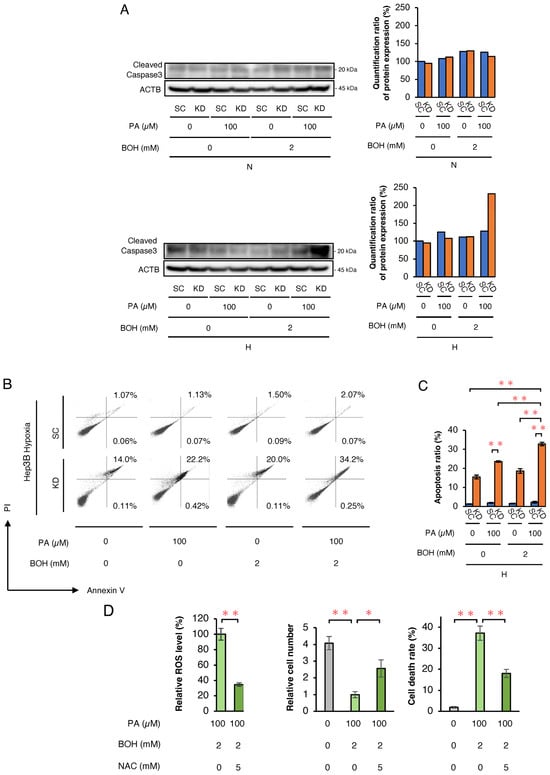 Next, Western blotting for cleaved caspase-3 was performed to assess cell apoptosis (Figure 2A). Under normoxic conditions, no differences were observed between Hep3B- SC and -KD cells. However, under hypoxic conditions, cleaved caspase-3 expression was markedly higher in KD cells treated with PA + BOH. Furthermore, to more precisely assess apoptosis induced by PA and/or BOH treatment, we conducted a flow cytometric analysis of apoptosis using Annexin V and PI staining in Hep3B-KD and -SC cells under hypoxic conditions. The proportion of apoptotic cells significantly increased with the addition of PA and was further elevated by combined treatment with PA and BOH (Figure 2B,C). These findings indicate that under hypoxic conditions, HIF-1α abrogation in KD cells may lead to excessive ROS production with PA and PA + BOH, subsequently inducing cell death by apoptosis. To confirm ROS-induced apoptosis with PA+BOH treatment, we treated hypoxic Hep3B-KD cells with the ROS scavenger N-acetylcysteine (NAC). Flow cytometric analysis demonstrated that intracellular ROS levels were effectively decreased by NAC in PA+BOH-treated KD cells under hypoxic conditions (Figure 2D). NAC treatment also reversed the PA+BOH-induced decrease in the viable cell number and increase in the cell death rate. These results clearly showed that PA+BOH-induced apoptosis in hypoxic KD cells was caused by excessive ROS production.