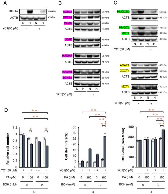 Analysis of the expression of key enzymes related to FA and ketone body metabolism in Hep3B cells with or without treatment by a HIF-1α inhibitor (YC-1). (A) Western blotting of the HIF-1α protein expression in wild-type Hep3B cells with/without YC-1 (50 µM) under normoxic (N) or hypoxic (H) conditions for 48 h. (B) Western blotting to analyze the protein expression of FAO-related enzymes (ACSL1, CPT1A, MCAD, LCAD, HADHA, ECHS1, and HADHB; shown by red box), (C) ketogenesis-related enzymes (HMGCS2, HMGCL, and MCT4; shown by green box), and ketolysis-related enzymes (ACAT1, OXCT1, and MCT1; shown by yellow box) in Hep3B cells with/without YC-1 (50 µM) under normoxic (N) or hypoxic (H) conditions for 48 h. The presented Western blot images are cropped from the original full-length blots, which are provided in Supplementary Information. For clarity, bands detected from the same membrane are grouped together above the loading control (ACTB). (D) Relative cell number, cell death rate, and ROS levels under hypoxic conditions in wild-type Hep3B cells with/without YC-1 (50 µM) treated with PA (0 or 100 μM) and/or BOH (0 or 2 mM) for 48 h. Data are presented as mean ± SEM (n = 3 independent experiments). Statistical significance was determined using one-way ANOVA followed by Tukey’s post hoc test. * p < 0.05, ** p < 0.01.