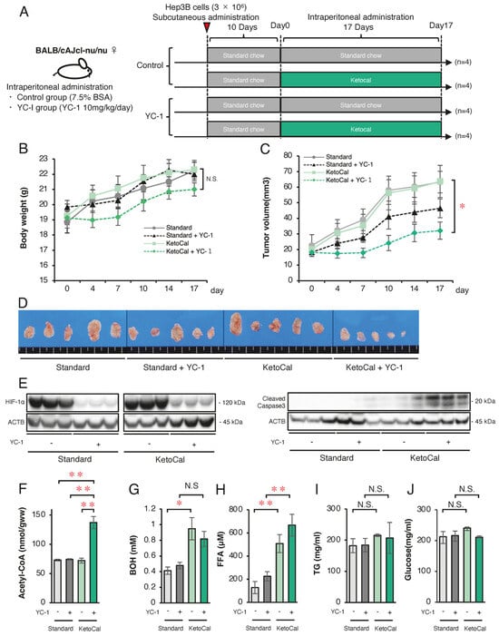 Effect of combined therapy with a ketogenic diet KetoCal® and YC-1 on tumor growth and metabolic markers in vivo. (A) Experimental schedule of Hep3B xenograft tumors in the four treatment groups (YC-1[-] with standard chow [n = 4], YC-1[+] with standard chow [n = 4], YC-1[-] with KetoCal® [n = 4], and YC-1[+] with KetoCal® [n = 4]). (B) Body weight transition of mice during the 17-day treatment period. (C) The mean tumor volume of Hep3B xenografts in the four treatment groups. Each group included four mice, with bilaterally subcutaneous implantation, resulting in 8 tumors analyzed per group. (D) The macroscopic appearance of tumors excised from mice in the four treatment groups. Each group consisted of four mice with bilateral subcutaneous tumors, resulting in eight tumors per group. Five representative tumors per group are shown in the figure for visual clarity. (E) Western blotting of HIF-1α and cleaved-caspase3 protein in Hep3B xenograft tumors excised from mice in the four treatment groups. (F) Intra-tumoral acetyl-CoA levels in Hep3B xenograft tumors excised from mice in the four treatment groups. (G–J) Blood examination of serum β-Hydroxybutyrate (BOH), free fatty acid (FFA), triglyceride (TG), and glucose levels in mice in the four treatment groups. The presented Western blot images are cropped from the original full-length blots, which are provided in Supplementary Information. For clarity, bands detected from the same membrane are grouped together above the loading control (ACTB). Data are presented as mean ± SD (n = 3 independent experiments). One-way ANOVA with Tukey’s post hoc test or unpaired Student’s t-test was applied as appropriate. N.S., not significant; * p < 0.05, ** p < 0.01.