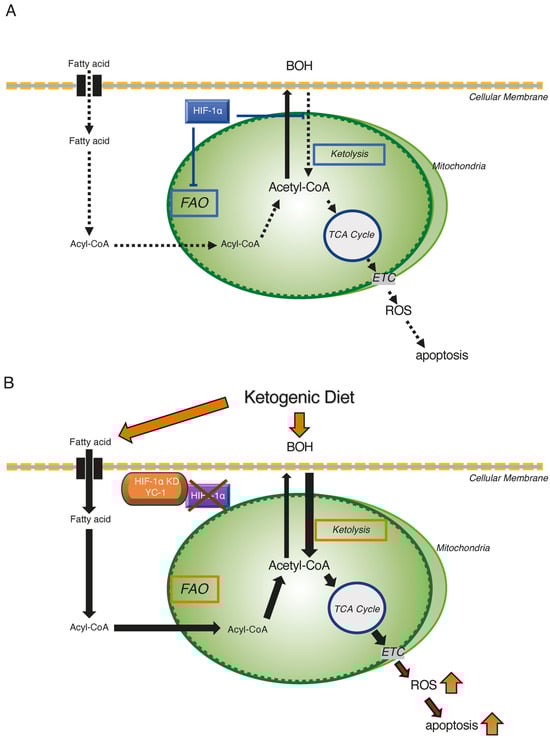 In conclusion, combination therapy with the HIF-1α inhibitor YC-1 and a ketogenic diet (KetoCal®) targets hypoxic regions in HCCs, where FA and ketone bodies are forcedly metabolized into acetyl-CoA through FAO and ketolysis in HIF-1α-depleted cells. Excessive acetyl-CoA enters the TCA cycle and generates lethal ROS via oxidative phosphorylation (OXPHOS). On the other hand, this treatment may not exert harmful effects on normal tissues living under normoxic environments where only a small amount of ROS may be produced. The oral administration of KetoCal® is actually used for the treatment of epilepsy in humans. Thus, the combination treatment with an HIF-1 inhibitor YC-1 + KetoCal® may provide a promising model of an anticancer strategy that targets hypoxic HCC cells. Furthermore, although the current study did not assess the influence of specific etiologies such as viral hepatitis, alcoholic liver disease, or metabolic dysfunction-associated steatotic liver disease, the observed mechanism—targeting hypoxia-driven metabolic vulnerabilities—may potentially be effective regardless of the underlying causes. This suggests that the combination of HIF-1α inhibition and ketogenic dietary intervention could serve as a broadly applicable therapeutic approach for hepatocellular carcinoma.
