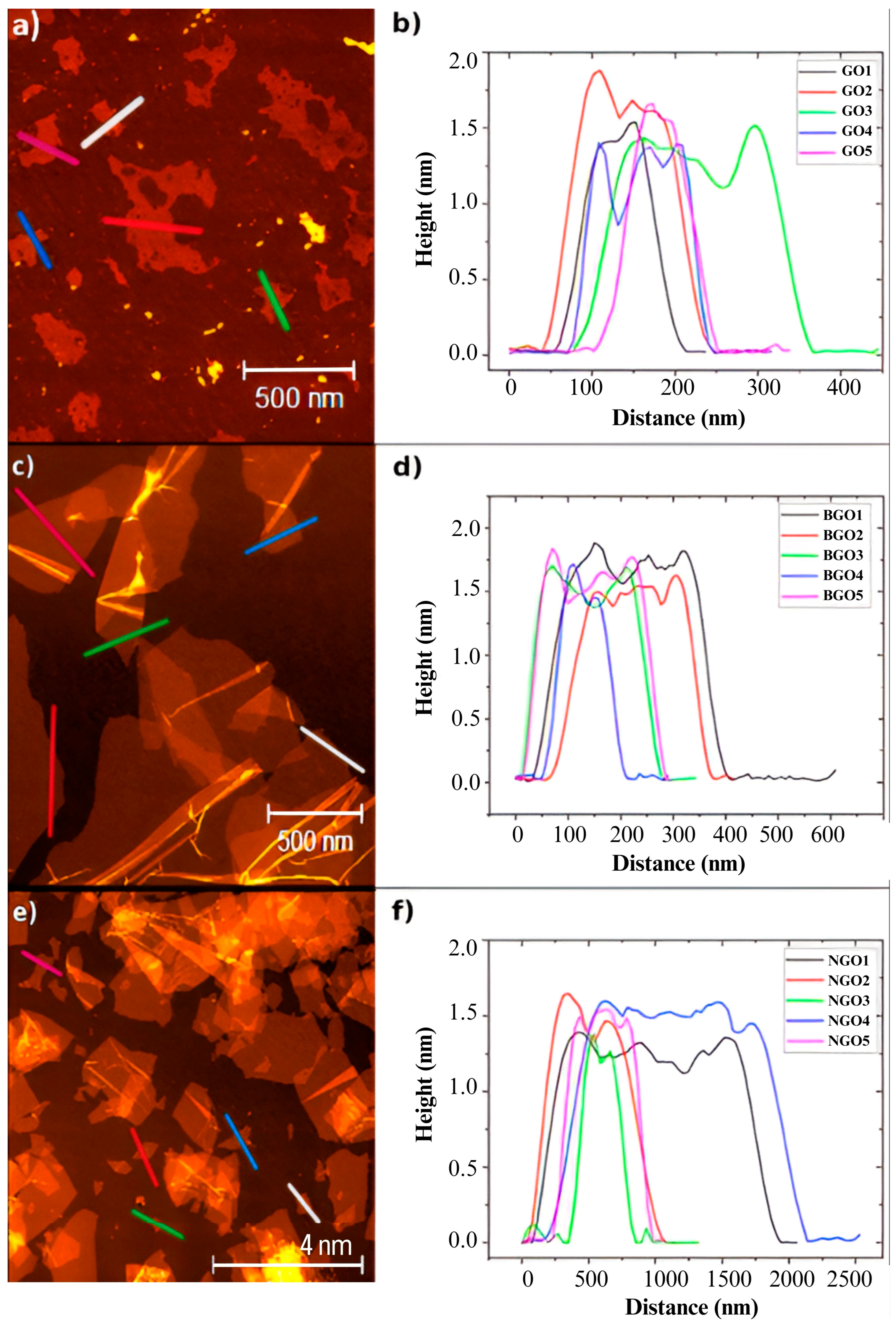 Figure 2. Thickness characterization (each line marked in the micrograph represents the areas in which a height profile was generated): (a) AFM graphene oxide micrograph, (b) Graphene oxide height profile, (c) AFM BGO micrograph, (d) BGO height profile, (e) AFM NGO micrograph, and (f) NGO height profile.