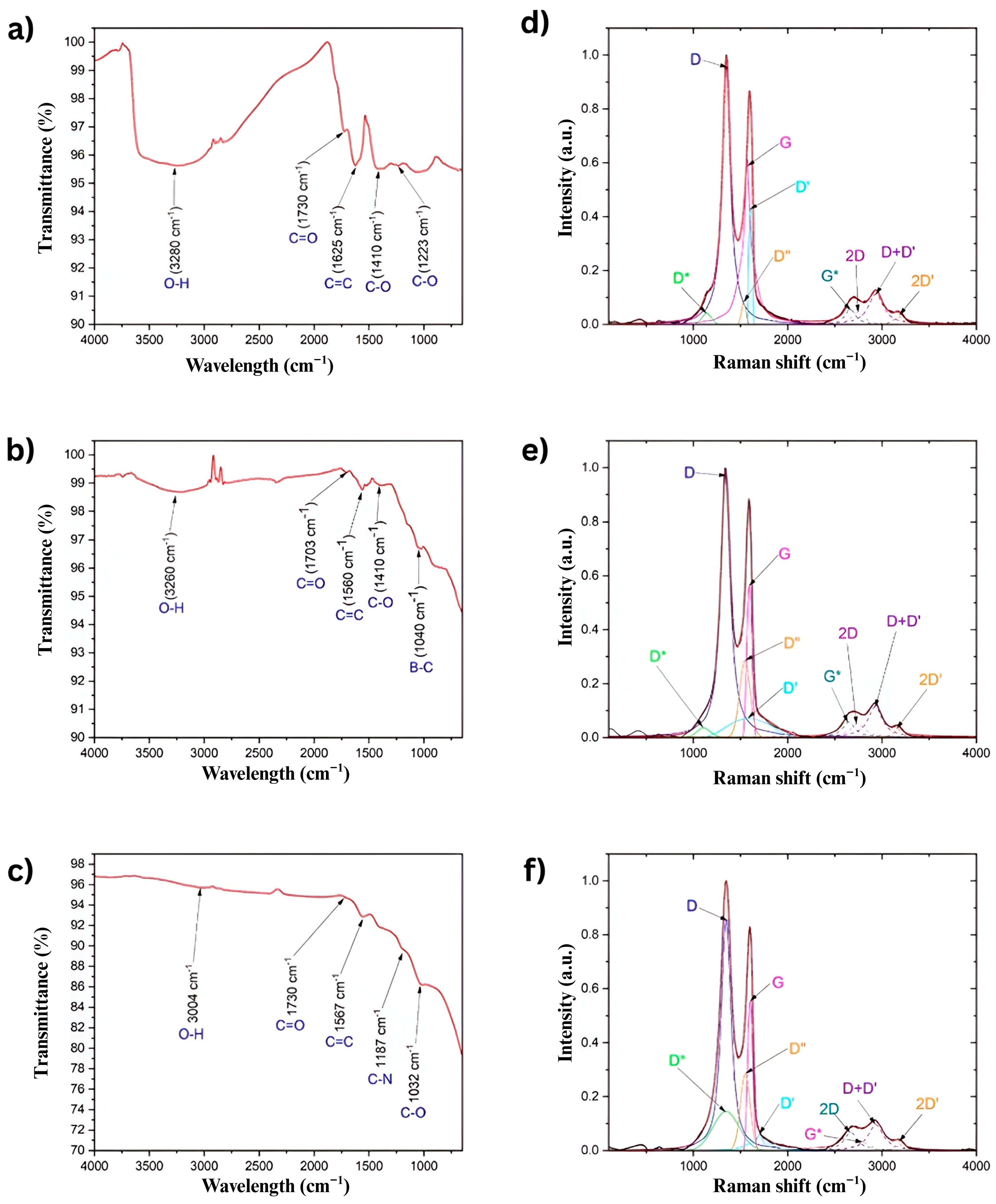 Figure 3. FTIR spectra of graphene oxide and doped graphene oxide: (a) GO, (b) BGO, (c) NGO. Raman spectra of graphene oxide and doped graphene oxide: (d) GO, (e) BGO, and (f) NGO.