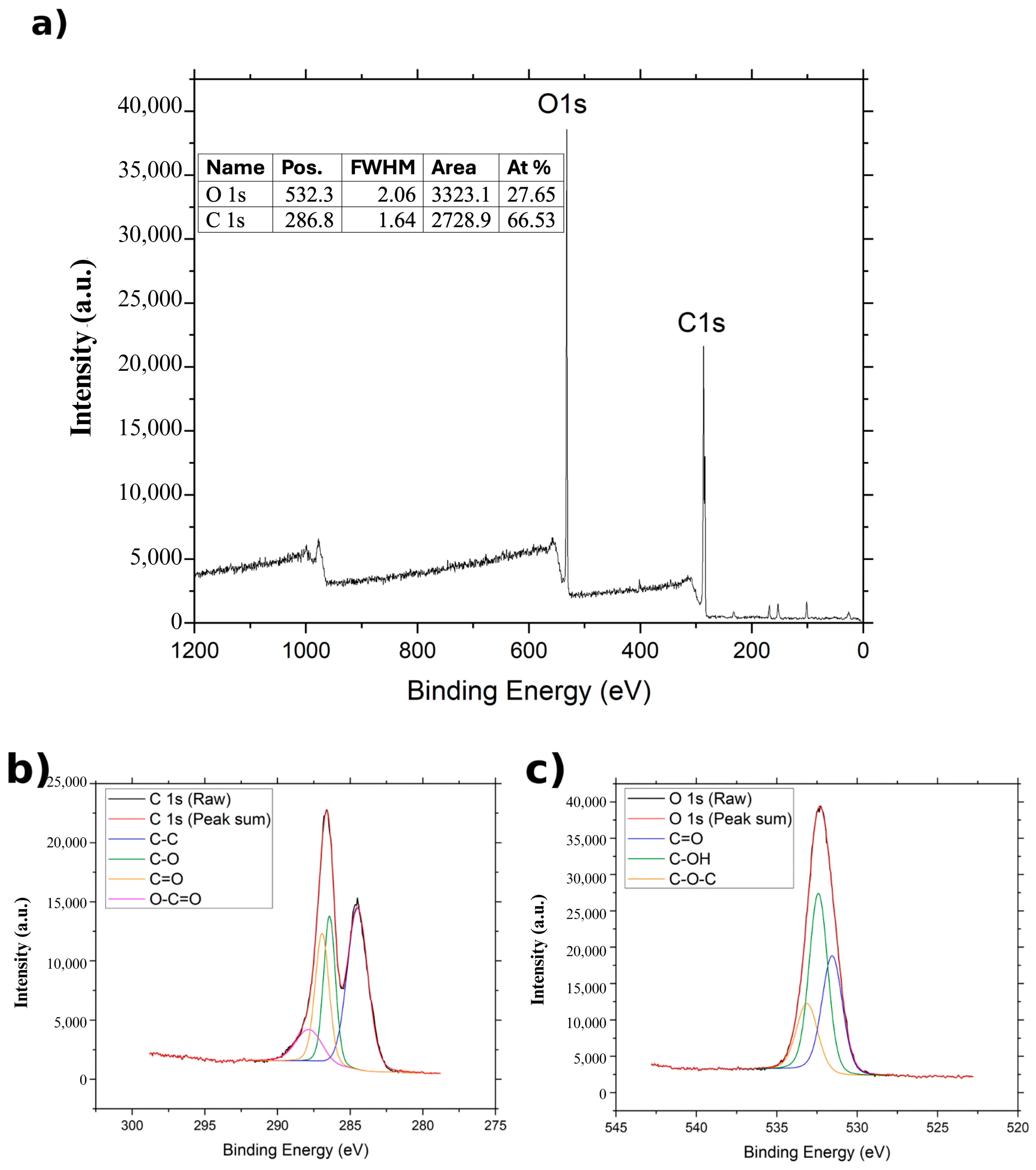 For GO (Figure 4), the C 1s spectrum can be deconvoluted into four components associated with different functional groups: C–C at 284.5 eV, C–O at 286.4 eV, C=O at 286.95 eV, and O–C=O at 287.85 eV [29]. The O 1s bands split into three contributions attributed to C=O, C–OH, and C–O–C groups, located at 531.507 eV, 532.407 eV, and 533.107 eV, respectively [29]. Elemental analysis shows an atomic composition of 65.53% carbon and 27.65% oxygen in the GO sample.