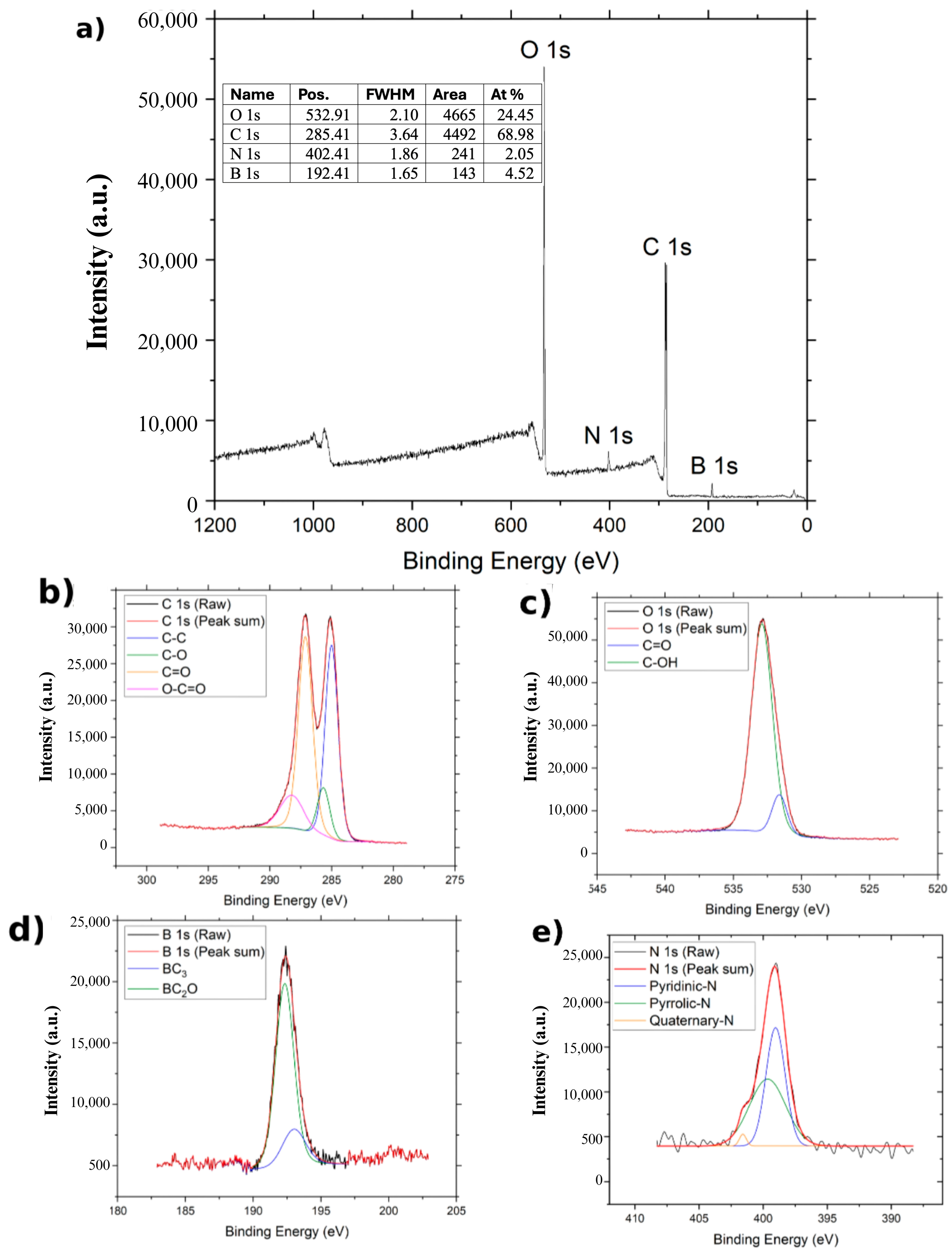 Figure 5. XPS spectrum of BGO: (a) XPS spectrum of BGO, (b) XPS spectrum of C1s region of BGO, (c) XPS spectrum of O1s region of GO, (d) XPS spectrum of B1s region of BGO and (e) XPS spectrum of N1s region of BGO.