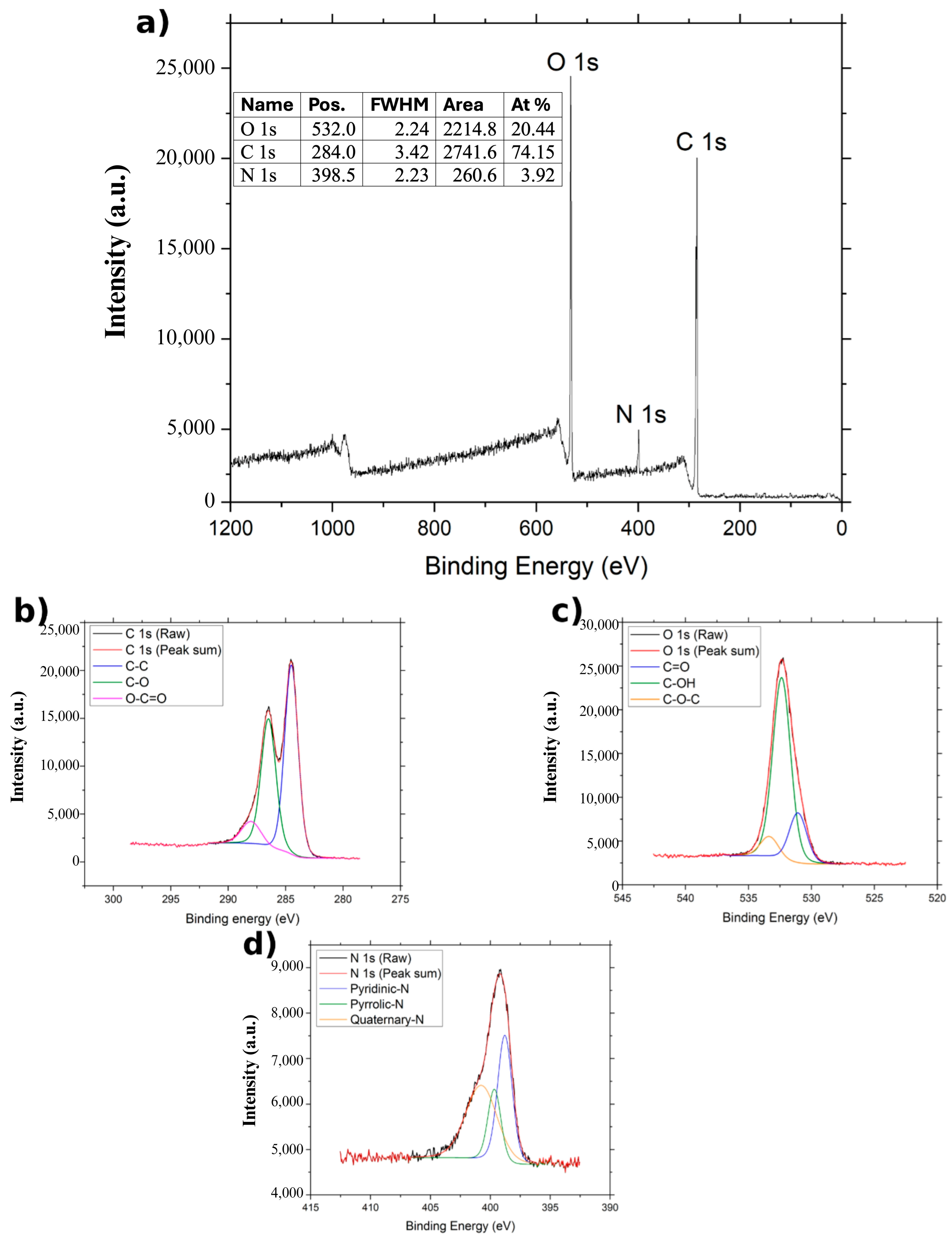 In the case of NGO (Figure 5), the C 1s bands are deconvoluted into three components: C–C at 284.48 eV, C–O at 286.48 eV, and O–C=O at 288.039 eV [22]. The O 1s region also reveals three bands corresponding to C=O (531.089 eV), C–OH (532.389 eV), and C–O–C (533.389 eV) [22]. In the survey spectrum (Figure 3a), a small band is observed around 400 eV, attributed to N 1s, confirming nitrogen incorporation. This N 1s region is deconvoluted into three bands corresponding to pyridinic (398.789 eV), pyrrolic (399.689 eV), and quaternary nitrogen (400.789 eV) [22]. The atomic composition of NGO is 74.15% carbon, 20.44% oxygen, and 3.92% nitrogen.