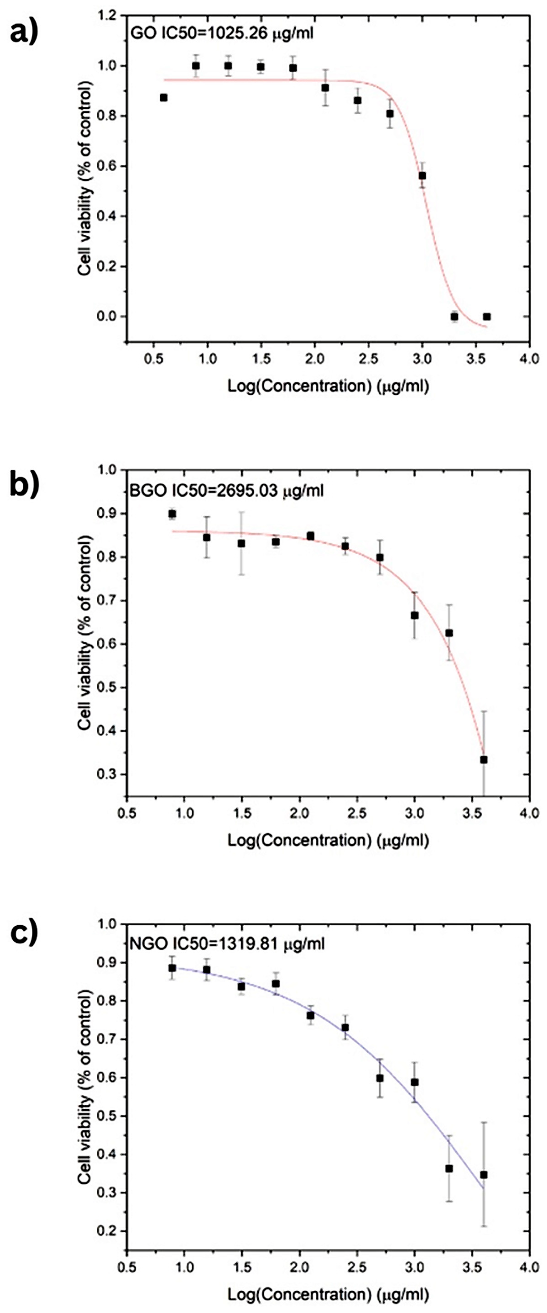 Figure 7. Cytotoxicity assay results and corresponding dose–response curve fits for (a) GO (fitting curve in red), (b) BGO (fitting curve in red), and (c) NGO (fitting curve in blue) in T-47D breast cancer cells. (IC50 values were calculated based on fluorescence viability data using resazurin dye after 24 h of treatment. Error bars represent standard deviations (n = 3).