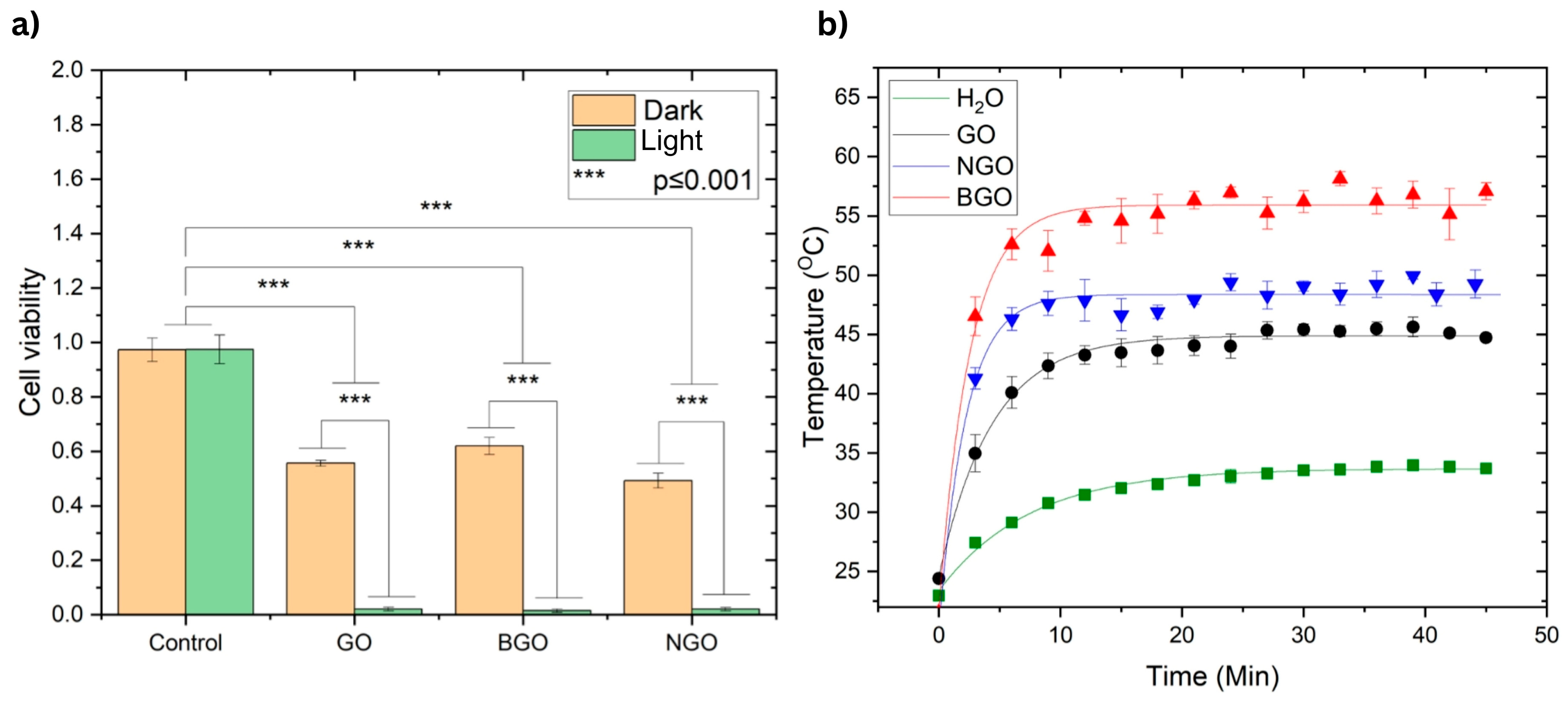 Figure 8a presents the results of the anticancer assays based on PTT using the T-47D breast cancer cell line. The concentrations used 1000 µg/mL for GO and NGO and 2000 µg/mL for BGO were selected from the region below the IC50 values obtained in the cytotoxicity assays. This ensured that the compounds alone would not cause excessive toxicity, allowing the photothermal effect to be evaluated independently of the toxicity. Samples were incubated with the nanomaterials for 3 h before irradiation, while cytotoxicity analysis was performed after 24 h of exposure.