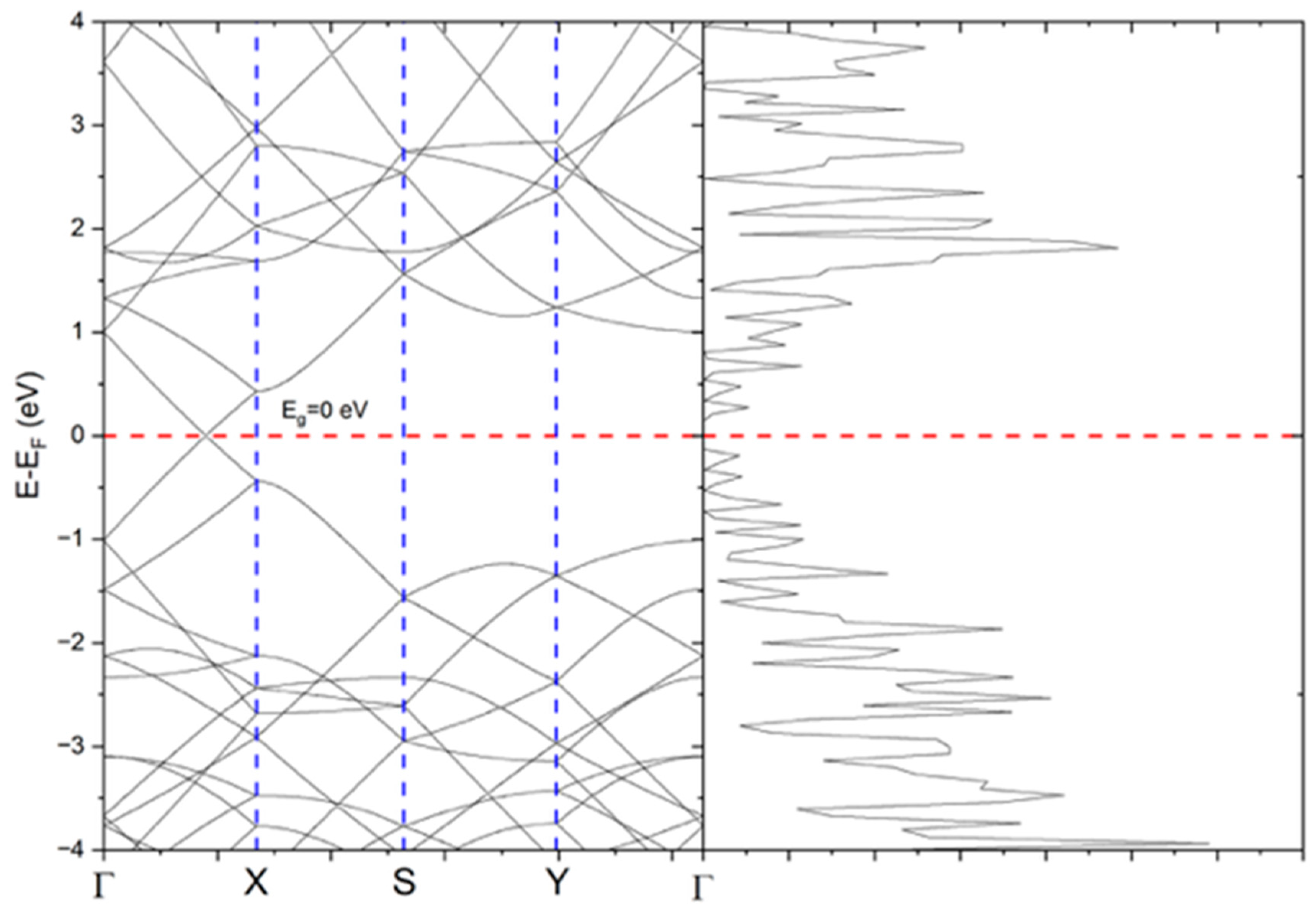 Figure 9. Band structure and density of states for a graphene lattice composed of 60 atoms organized in an orthorhombic superlattice. The red dashed line marks the Fermi level (E − E_F = 0 eV). The blue dashed vertical lines indicate the high-symmetry points along the k-path (Γ–X–S–Y–Γ) used for the band-structure calculation.