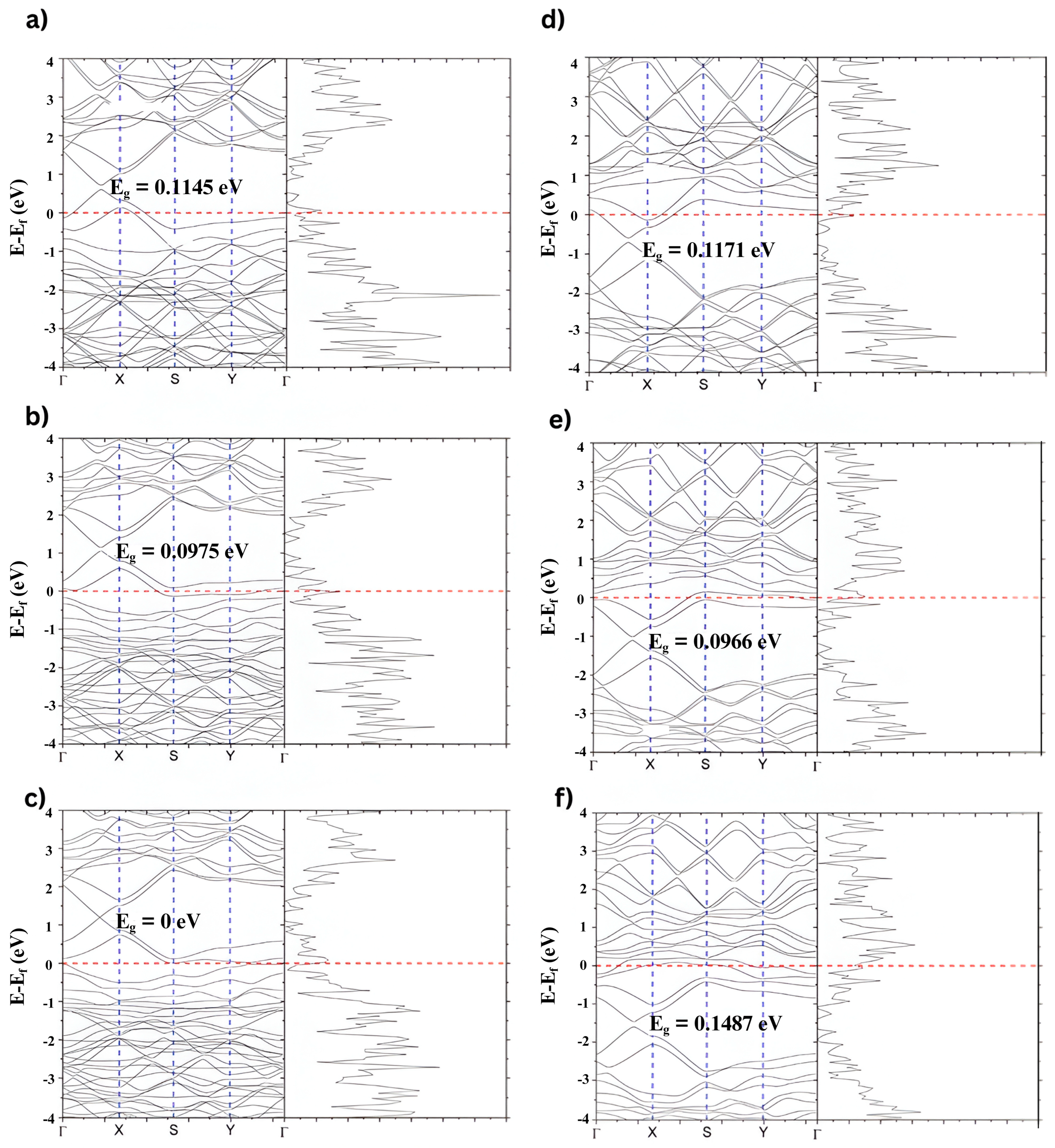 Figure 10. Band structure and density of states of a graphene lattice doped at different concentrations, organized in an orthorhombic superlattice. (a) Graphene doped with 1.67% boron, (b) Graphene doped with 5% boron, (c) Graphene doped with 6.67% boron, (d) Graphene doped with 1.67% nitrogen, (e) Graphene doped with 5% nitrogen, and (f) Graphene doped with 10% nitrogen. The red dashed line marks the Fermi level (E − E_F = 0 eV). The blue dashed vertical lines indicate the high-symmetry points along the k-path (Γ–X–S–Y–Γ) used for the band-structure calculation.