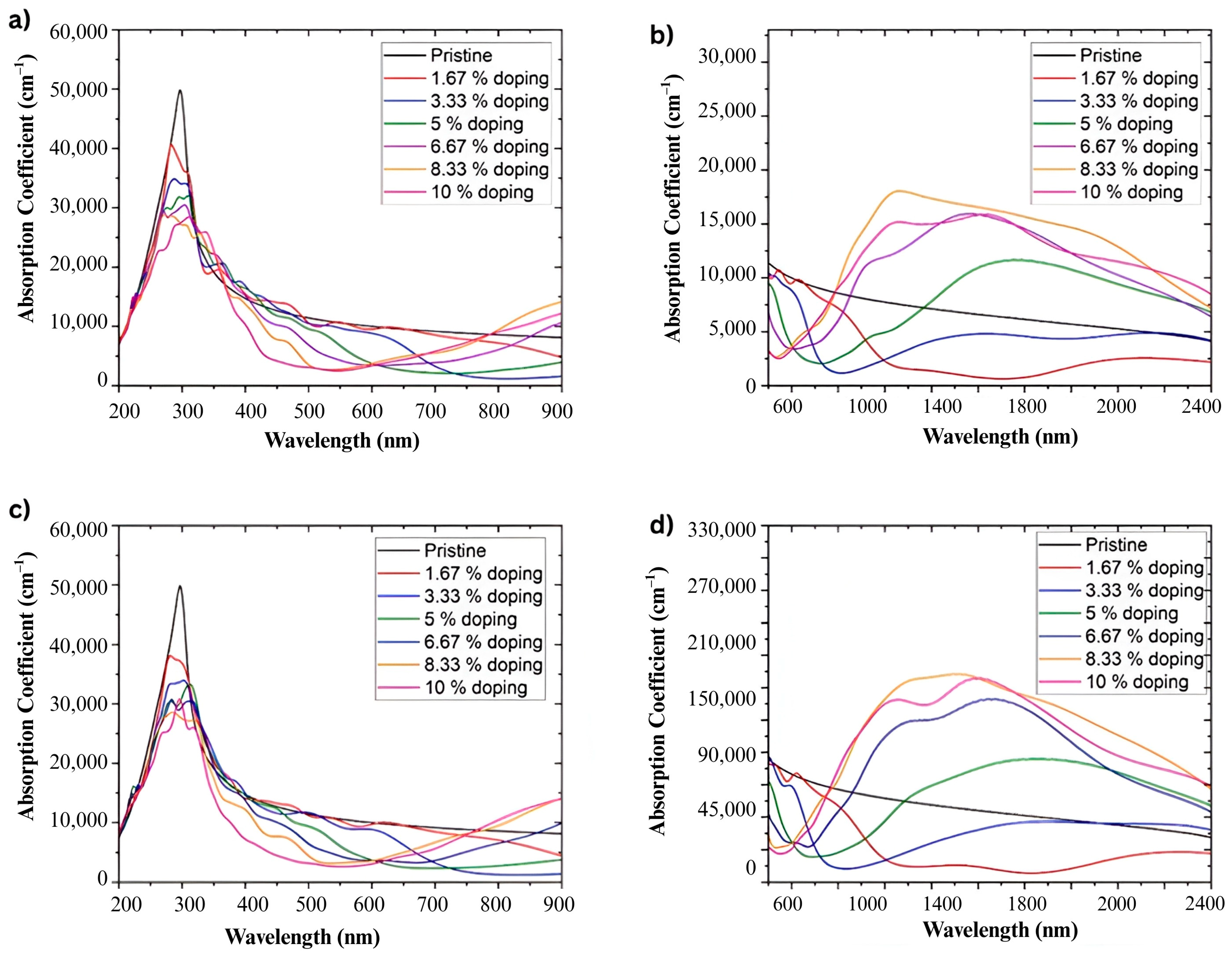 On the other hand, Figure 11b,d display the absorbance coefficient in the range of 500 nm to 2400 nm. The absorbance coefficient increases with increasing doping percentage. For doping at 1.67%, the absorbance coefficient decreases compared to pristine graphene. However, for 3.33% doping, this coefficient increases with the wavelength, reaching levels similar to pristine graphene and then surpassing it at higher doping, especially around 1425 nm, as seen in Figure 11b.