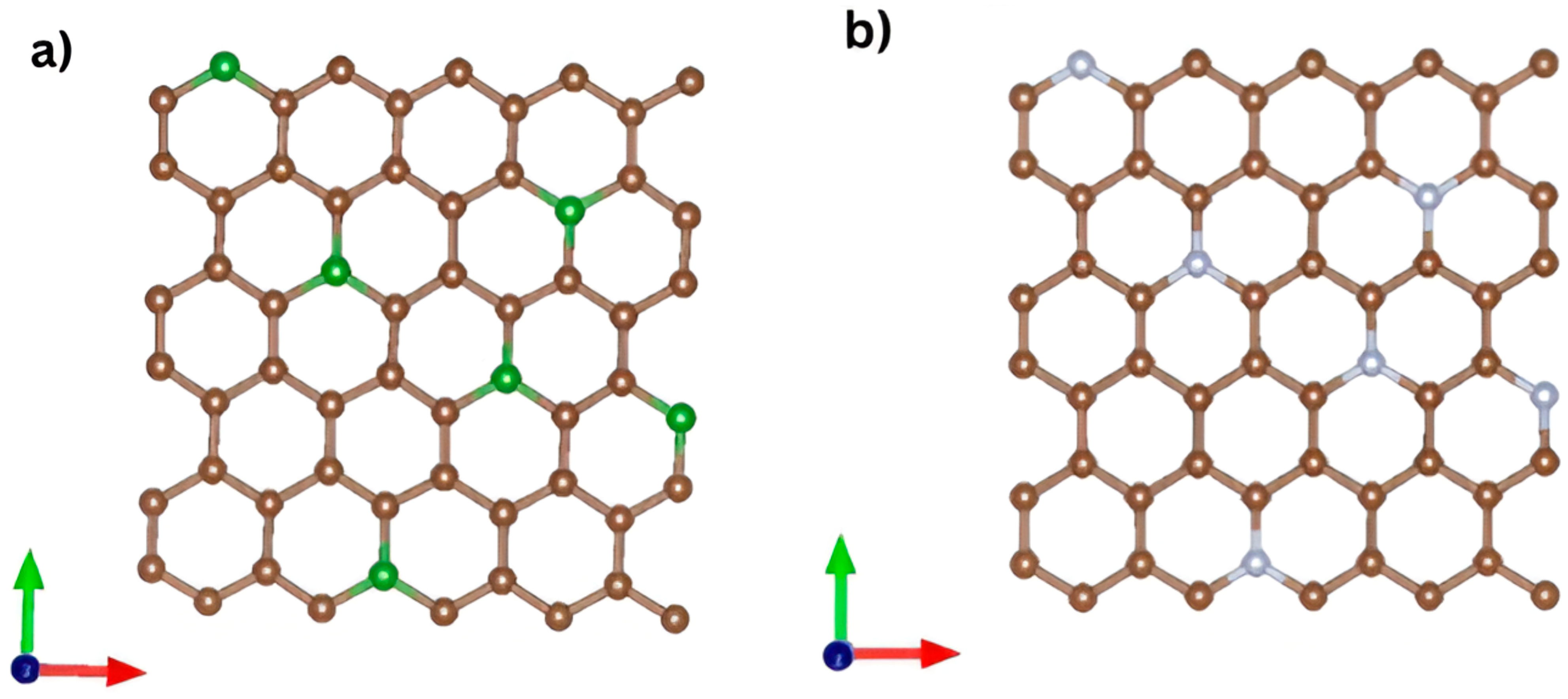 Figure 12. Models used in the simulations: (a) Graphene lattice doped with 10% nitrogen, where brown and blue spheres represent C and N atoms, respectively. (b) Graphene lattice doped with 10% boron, where brown and green spheres represent C and B atoms, respectively.