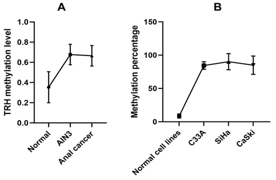 TRH methylation analysis. (A) Data obtained from GSE186859 dataset, methylation levels at cg01009664 of TRH gene in anal cells with different anal lesions stratified by histology as normal (9 samples), AIN3 (13 samples) and anal cancer (121 samples). (B) Pyrosequencing analysis data of normal and cervical cancer cell lines.
