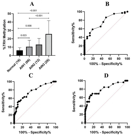TRH methylation analysis in anal samples with different lesion severity. (A) Average methylation percentage of five CpGs at cg01009664 of TRH gene in anal samples stratified by histology as normal, AIN1, AIN2 and AIN3. Error bars in the bar graph represent the mean with standard deviation (SD). There were statistically significant differences among the groups (p < 0.001). Error bars in the bar graph represent the mean with standard deviation (SD). The Kruskal–Wallis test was used to compare the differences among the groups. (B) ROC of average TRH methylation of five CpGs to differentiate between normal and AIN1+ lesions. AUC was 0.7674 (95% CI: 0.6544–0.8804) (p-value = 0.0006). (C) ROC of average TRH methylation of five CpGs to differentiate between ≤AIN1 and AIN2+ lesions. AUC was 0.7667 (95% CI: 0.6728–0.8606) (p-value = 0.0001). (D) ROC of average TRH methylation of five CpGs to differentiate between ≤AIN2 and AIN3 lesions. AUC was 0.8048 (95% CI: 0.6991–0.9106) (p-value = 0.0001).