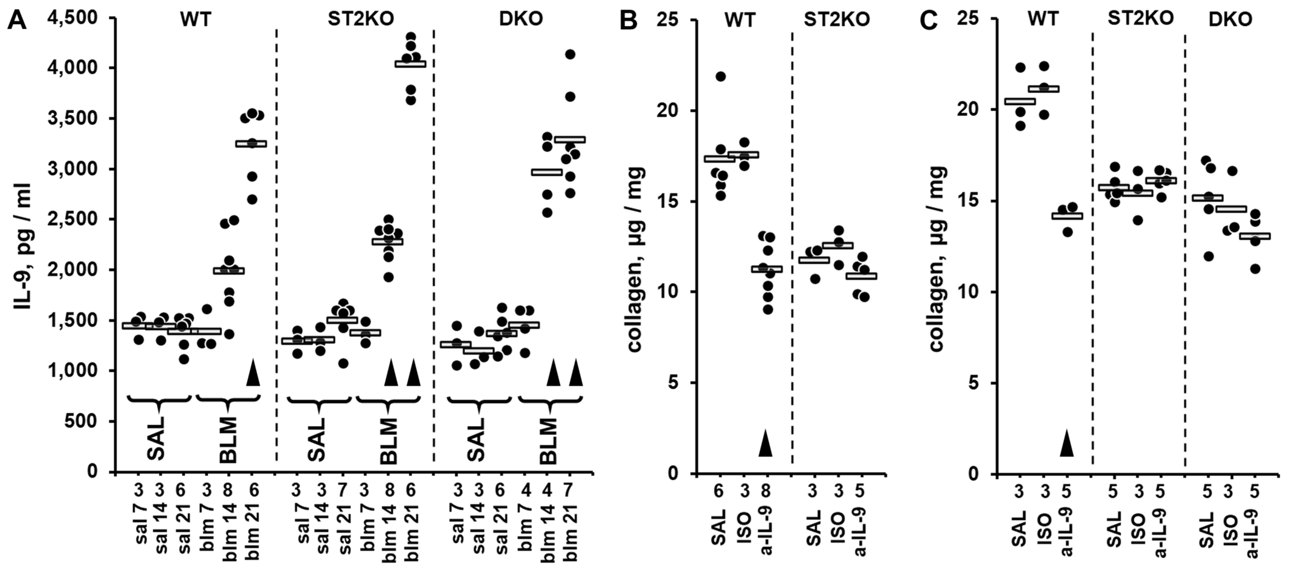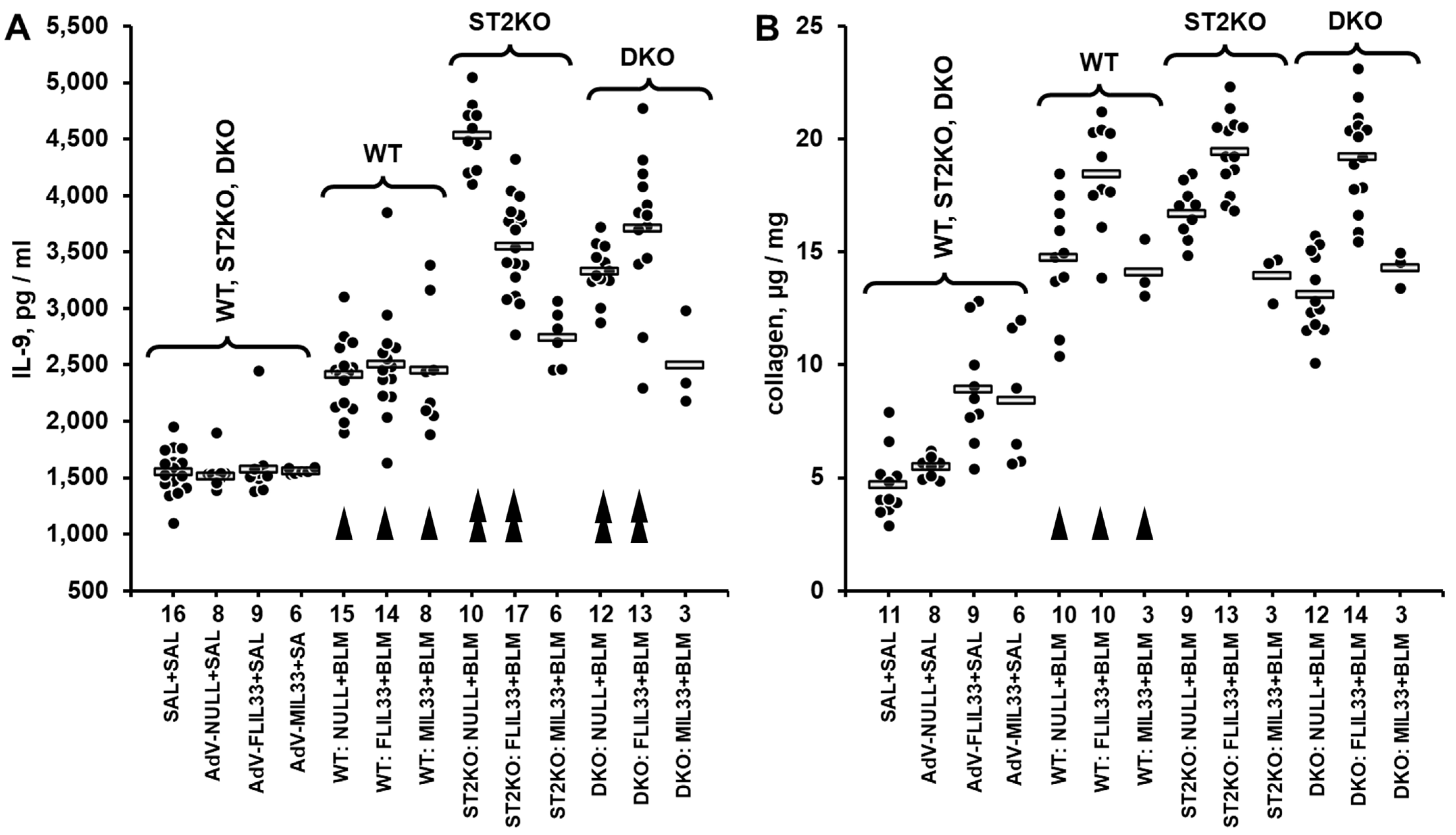 2.2. Bleomycin Injury-Induced Elevation in Pulmonary IL-9 Persists and Is Enhanced Is ST2-Deficient Mice