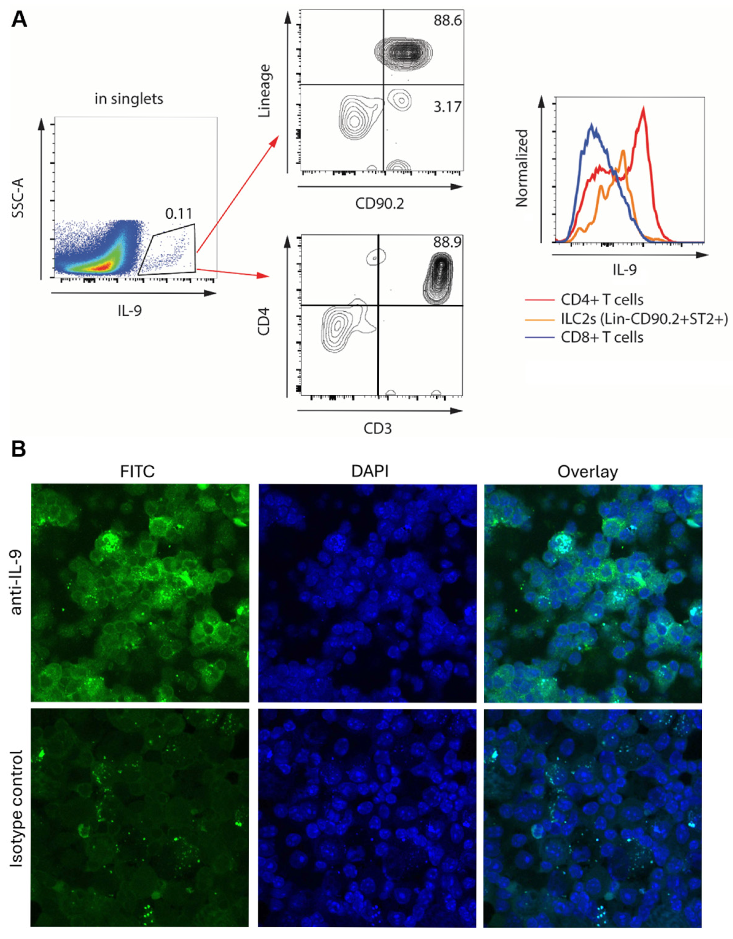 - Bick, F.; Blanchetot, C.; Lambrecht, B.N.; Schuijs, M.J. A reappraisal of IL-9 in inflammation and cancer. Mucosal Immunol. 2024, 18, 1–15. [Google Scholar] [CrossRef] [PubMed]