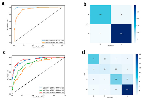 Performance represented with (a,c) ROC-AUC curves and (b,d) confusion matrix on the test set for binary and multiclass classifiers, respectively.