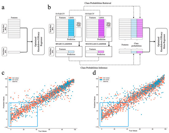 Quality of (a,c) vanilla regression and (b,d) two-stage probability-enhanced regression model performance in quantitative gene knockdown efficacy prediction on training and test data. Probabilities of all categories (blue and violet columns) were obtained from both classifiers. The gear symbol indicates the algorithms were optimized via feature selection and hyperparameter tuning at each stage of 10-fold CV. Red dots stand for the train samples, blue—for test samples. Blue box highlights the differences in models’ performance on low-activity samples.