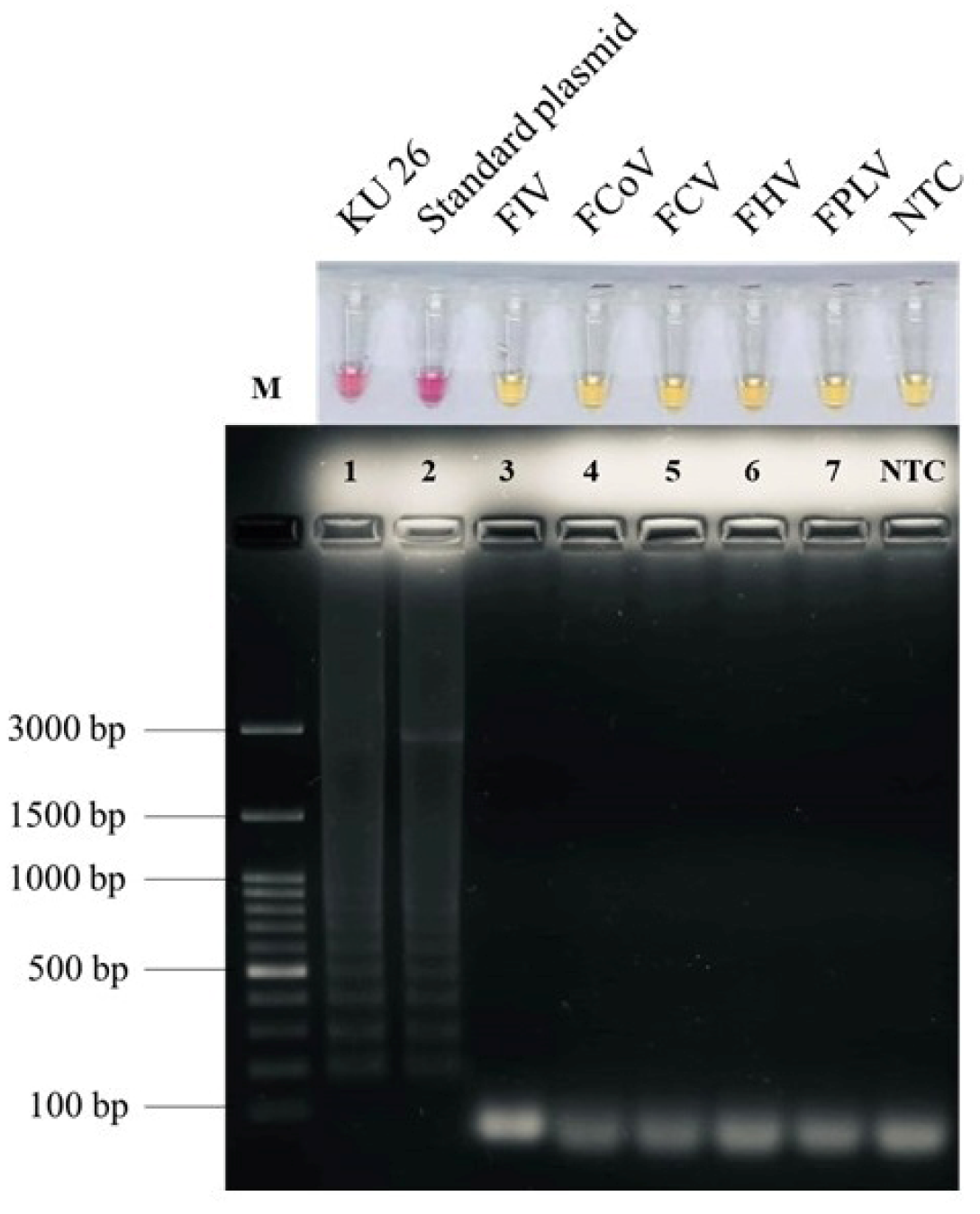 - Saejung, W.; Khumtong, K.; Rapichai, W.; Ratanabunyong, S.; Rattanasrisomporn, A.; Choowongkomon, K.; Rungsuriyawiboon, O.; Rattanasrisomporn, J. Detection of Feline Immunodeficiency Virus by Neutral Red-Based Loop-Mediated Isothermal Amplification Assay. Vet. World 2024, 17, 72–81. [Google Scholar] [CrossRef] [PubMed]