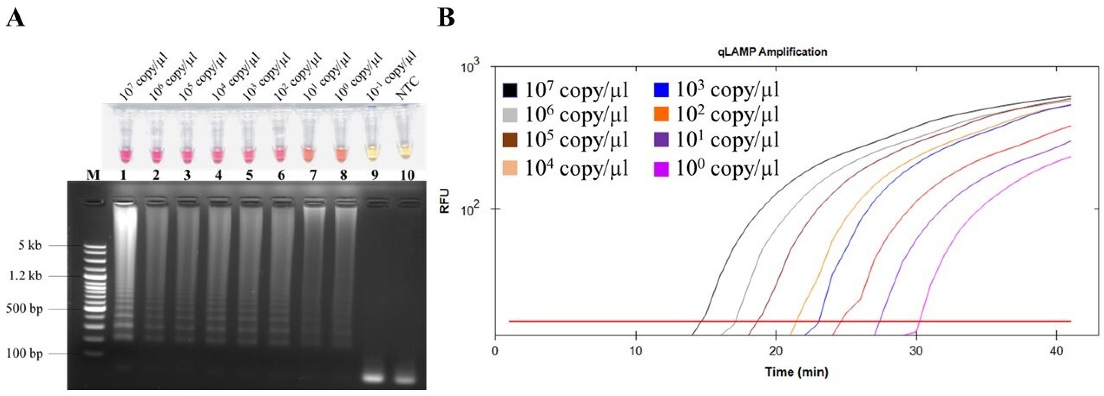 | NR-LAMP | pol gene | 100 | 40 | 97.3/100 | This work |