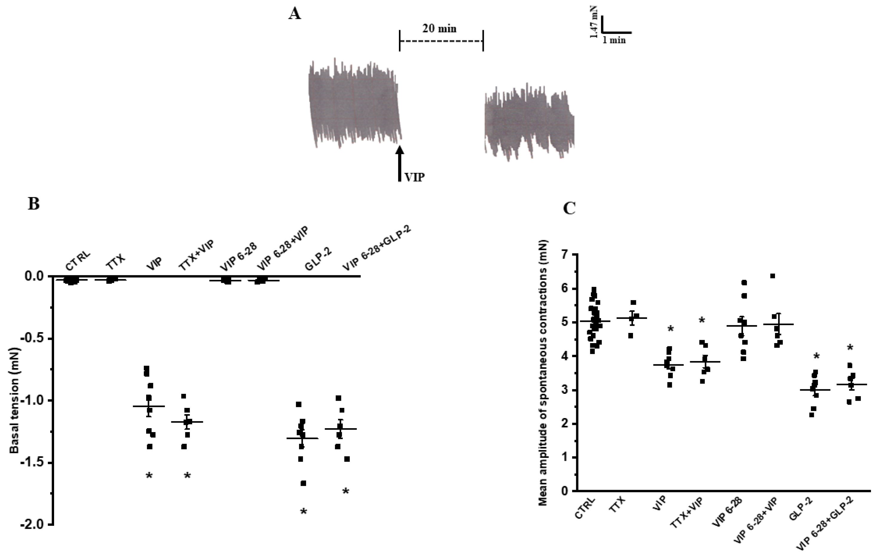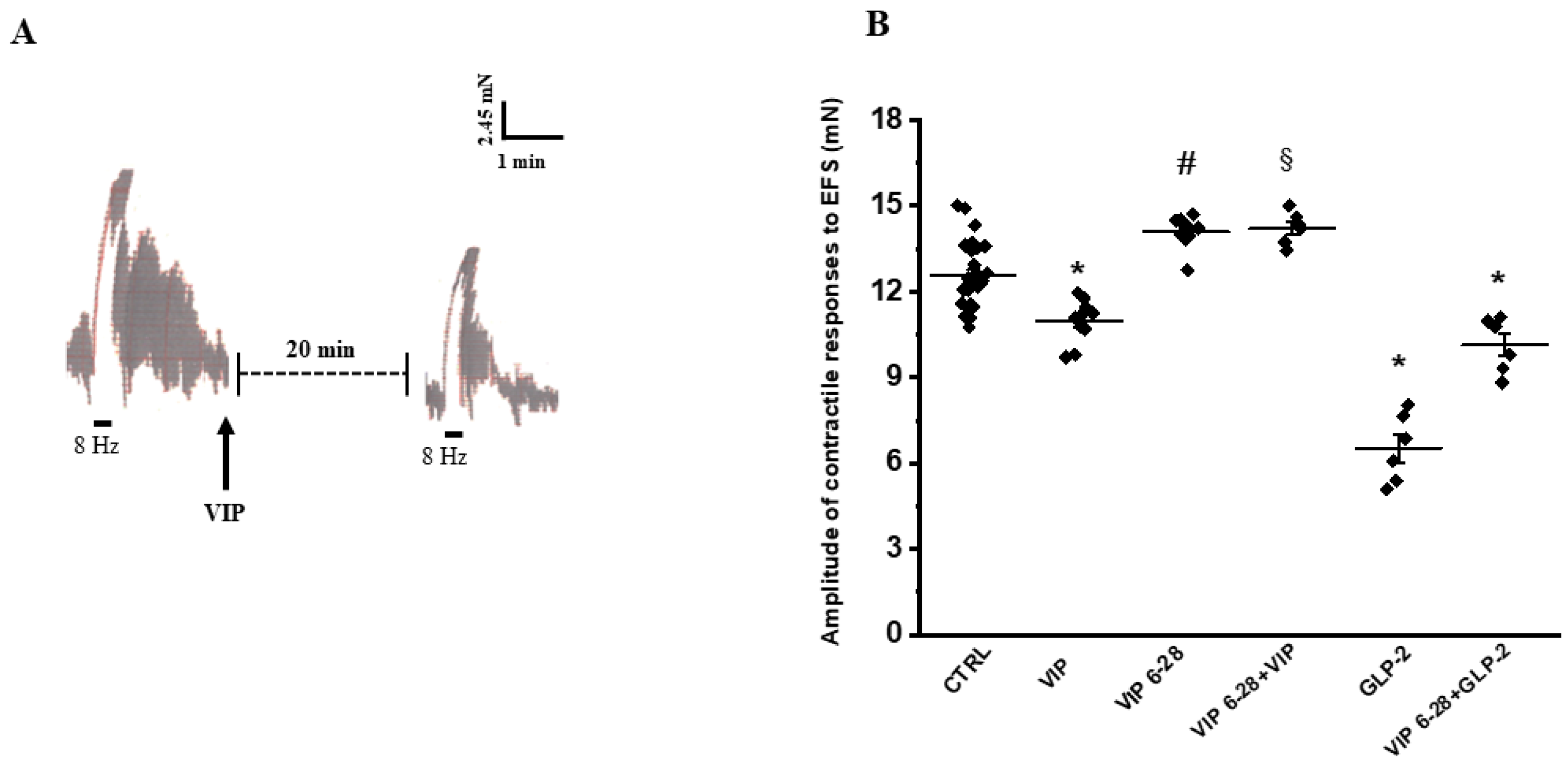 - Traini, C.; Idrizaj, E.; Garella, R.; Squecco, R.; Vannucchi, M.G.; Baccari, M.C. Glucagon-like Peptide-2 Interferes with Neurally-Induced Relaxant Responses in Mouse Gastric Strips Through VIP Release. Neuropeptides 2020, 81, 102031. [Google Scholar] [CrossRef] [PubMed]