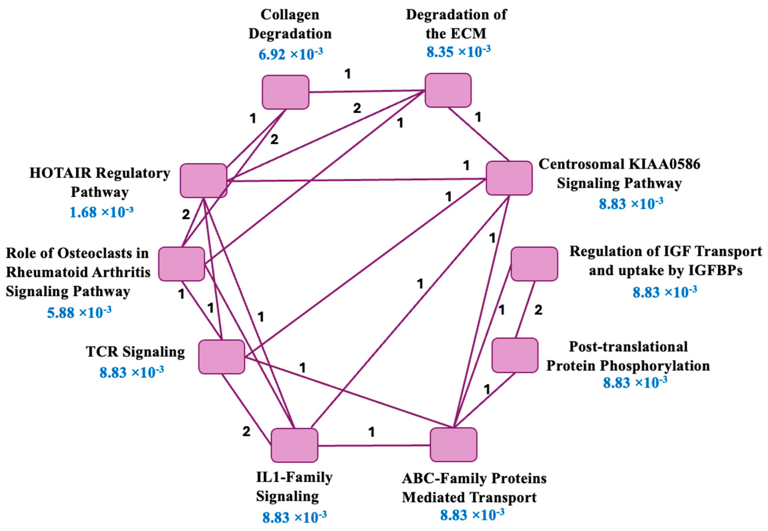 | 2 | Role of Osteoclasts in rheumatoid arthritis | 5.88 × 10−3 | MMP12, ADAM9, NFKBIA |