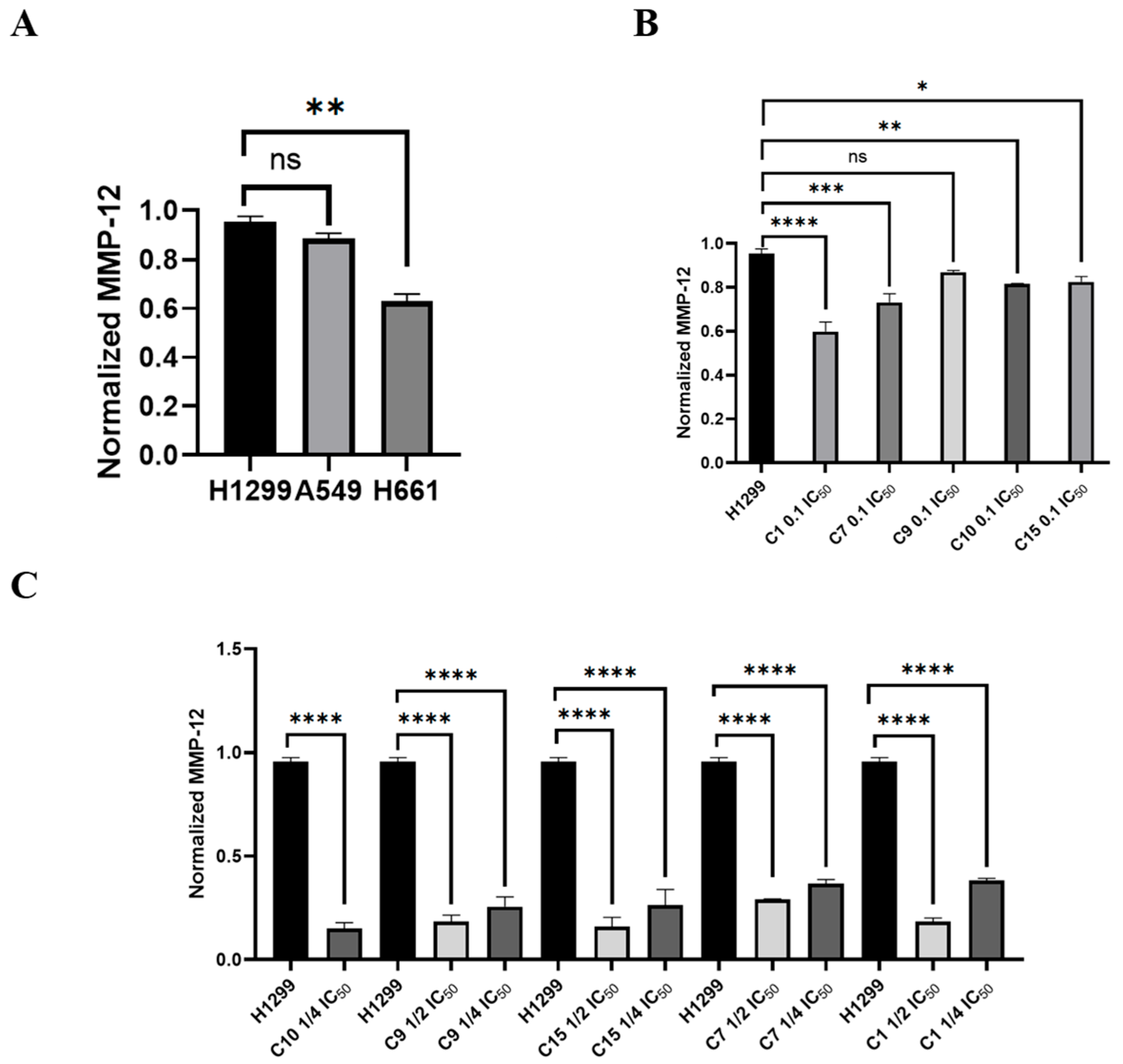 2.2.5. Effect of MMP12 Inhibitors on Gene Expression of H1299 Lung Cancer Cells