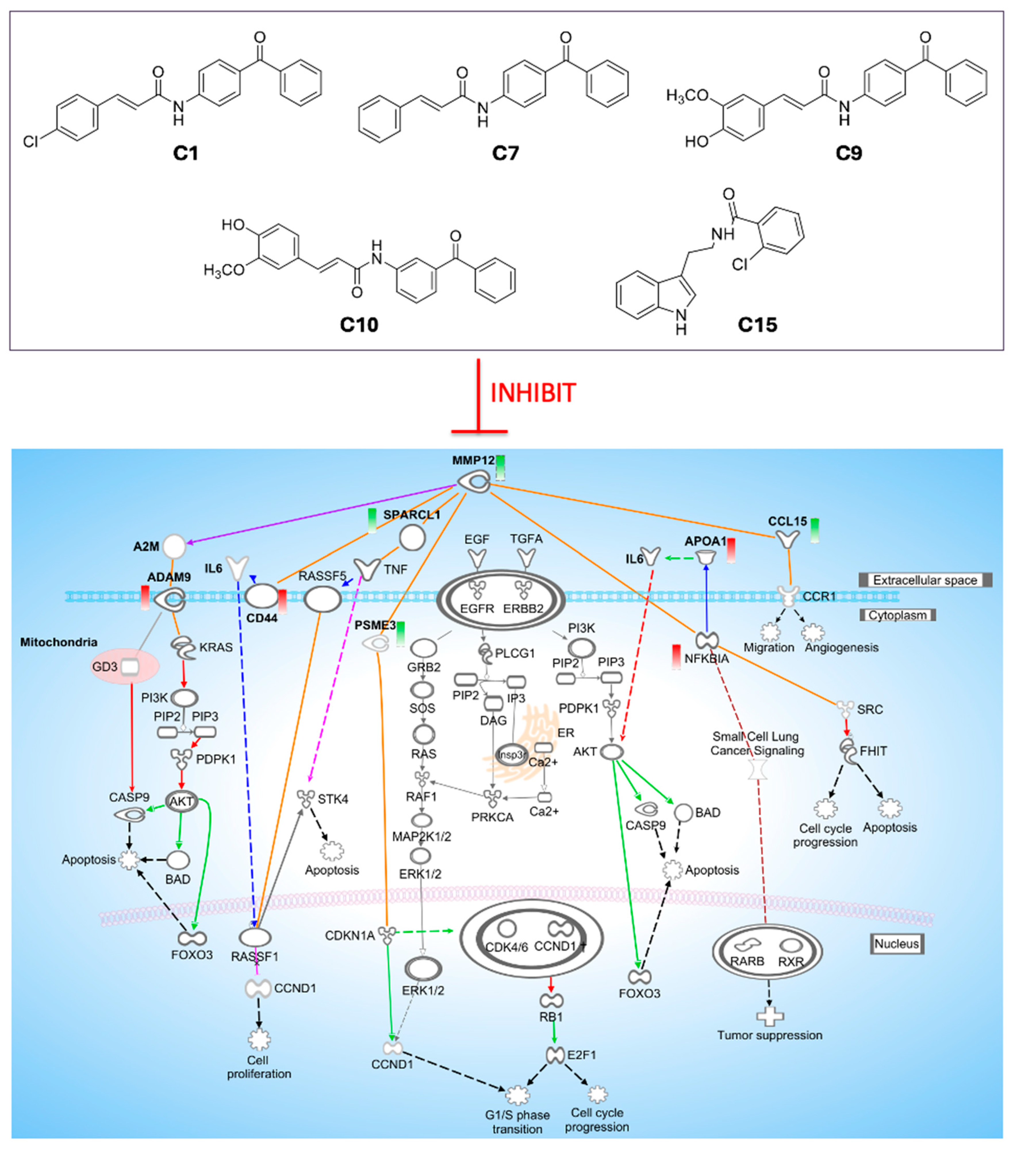 | 5 | MAP3K11 | ↓ CD44, ↓ MMP12, ↑ NFKBIA, ↓ PSME3 | −1.00 | C1, C7, C10, C15 |