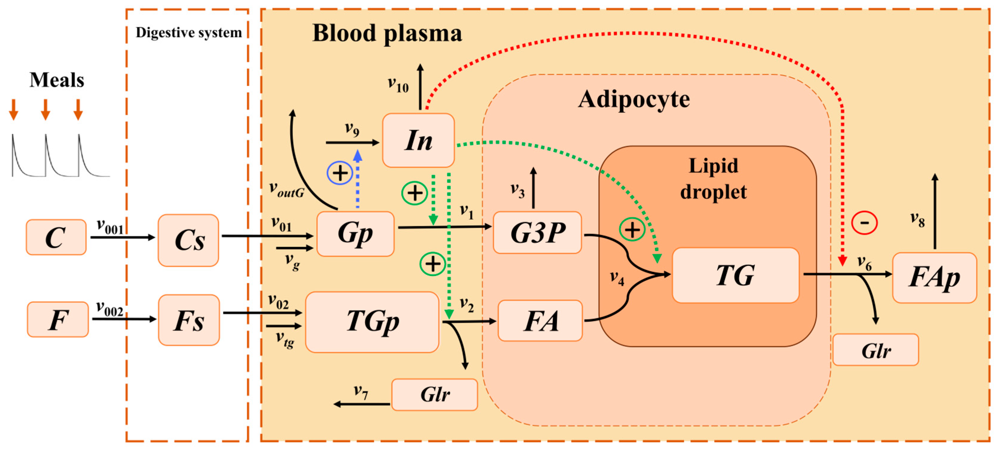 In the blood plasma, triglycerides (TGp) underwent lipolysis, yielding one molecule of glycerol (Glr) per one molecule of TGp, which was transported to other organs and tissues at a rate of , and three molecules of fatty acids (FA), which entered the adipocyte at a rate of . In addition to the intake of triglycerides TGp from food, their influx from the liver was considered at a constant rate .