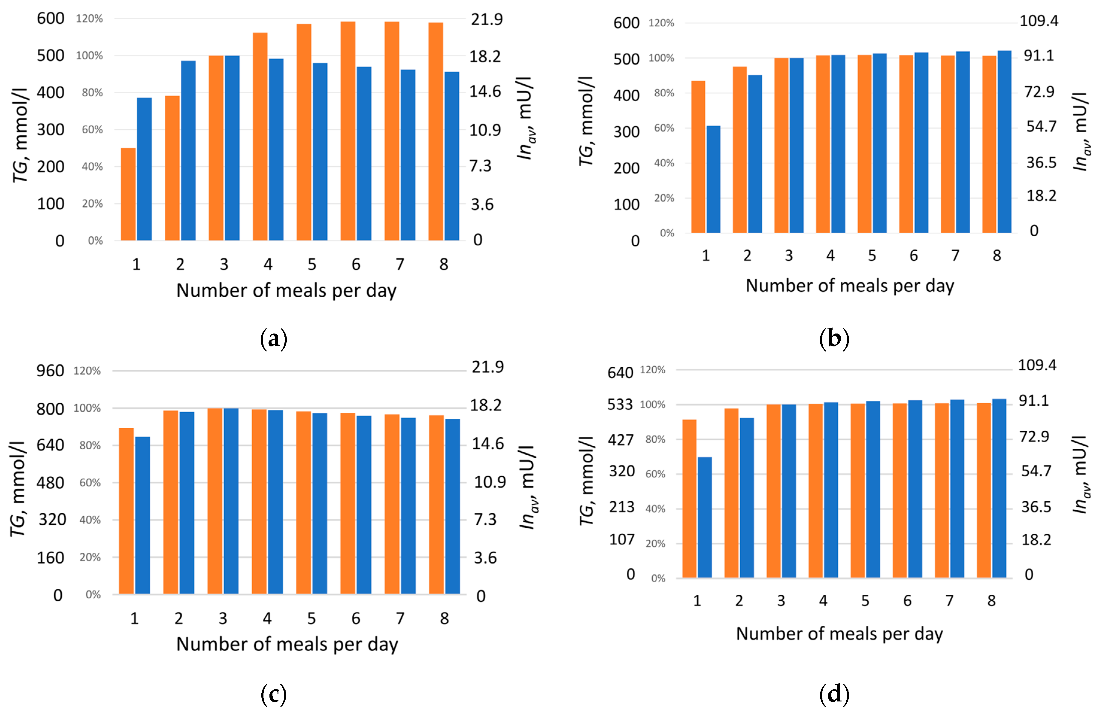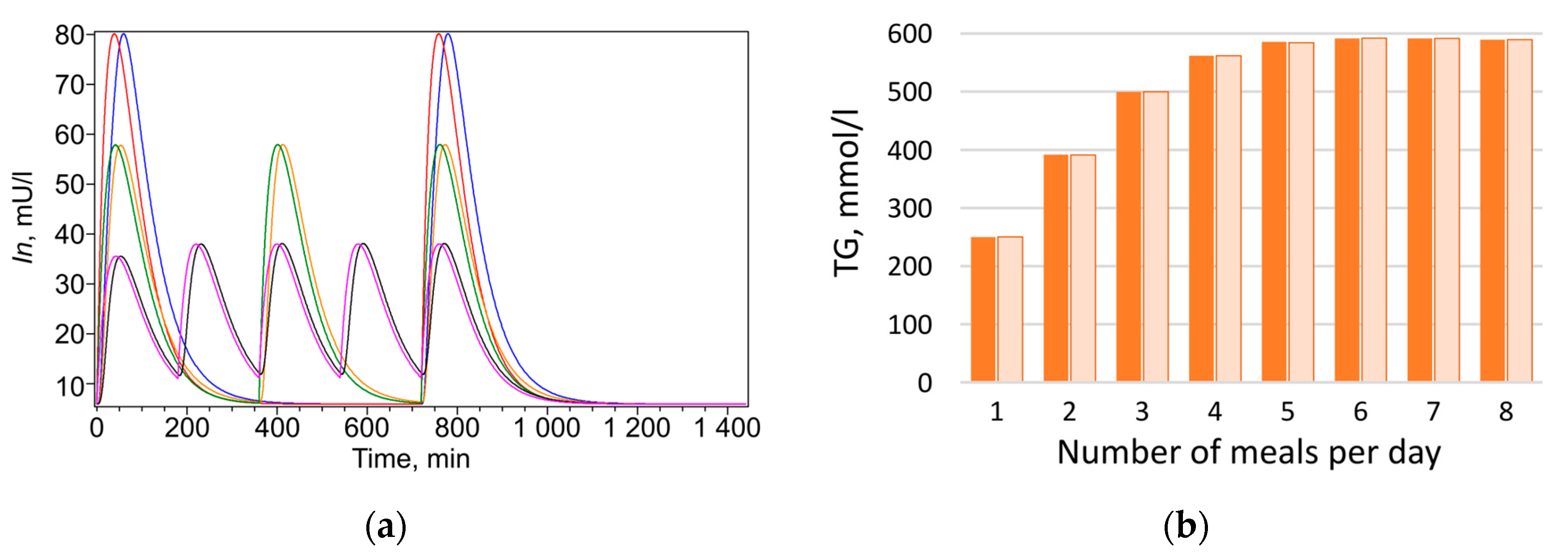 Thus, the obtained results indicate that the meal regimen, even under isocaloric conditions, may significantly affect the lipid metabolism through the formation of a specific insulin profile. Frequent feeding, despite lower insulin peaks compared to less frequent meals, leads to more sustained suppression of lipolysis and consequently greater triglyceride accumulation, particularly when significant peak overlap is absent. This effect is most pronounced in healthy individuals and attenuated under insulin resistance.