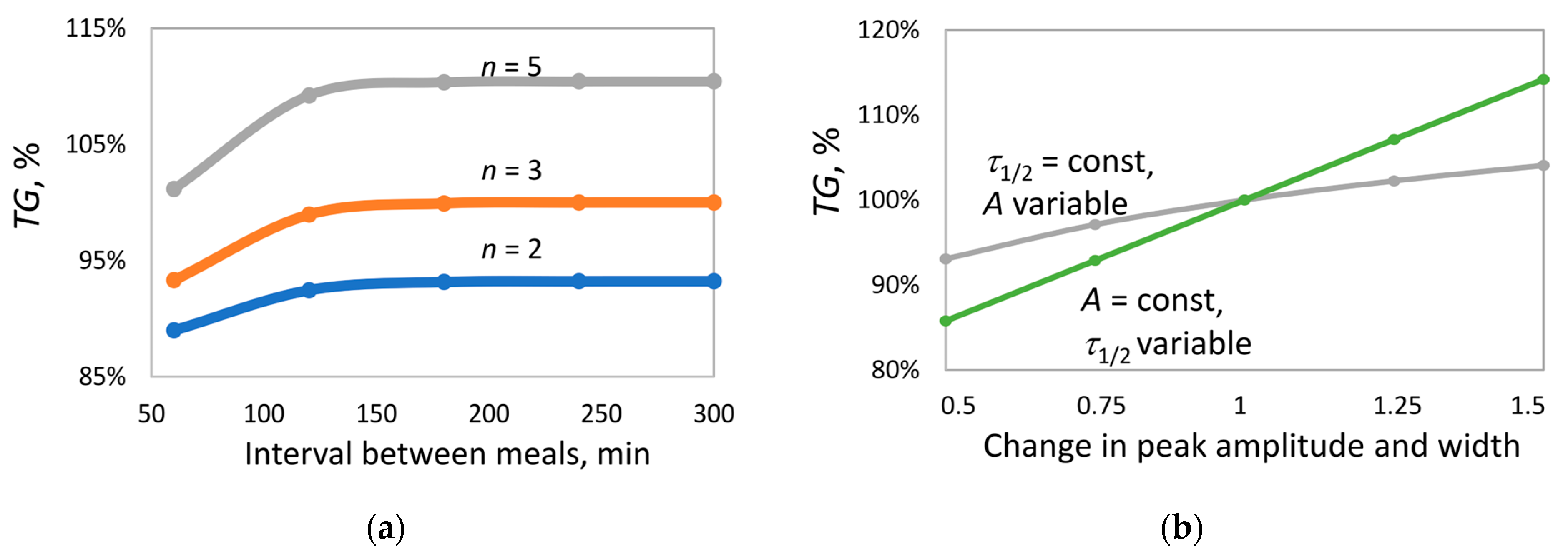 Figure 6b), the effects of amplitude and peak width on triglyceride accumulation were compared. According to Formula (6), altering either parameter results in a proportional change in the average insulin level (