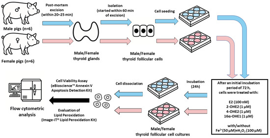 - Stępniak, J.; Karbownik-Lewińska, M. 17β-Estradiol Stimulates Oxidative Stress Components and Thyroid Specific Genes in Porcine Thyroid Follicular Cells: Potential Differences Between Sexes. Cells 2024, 13, 1769. [Google Scholar] [CrossRef] [PubMed]