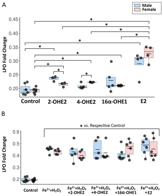 The graph presents a comparison of the effects of individual estradiol metabolites (2-OHE2, 4-OHE2, 16α-OHE1) and E2 on lipid peroxidation in female- and male-derived thyroid cells in basal conditions (A) and with Fenton reaction substrates (B). Lipid peroxidation in cells was quantified based on the ratio of fluorescence signals at 590 nm (red—before oxidation) to 510 nm (green—after oxidation). To enhance data visualization, results are expressed as 1/(590/510 ratio). The central line represents the median, the box spans the interquartile range (25th to 75th percentile), and the whiskers indicate the minimum and maximum values, the short horizontal line denotes the mean. n ≥ 3 independent experiments. * p < 0.05.