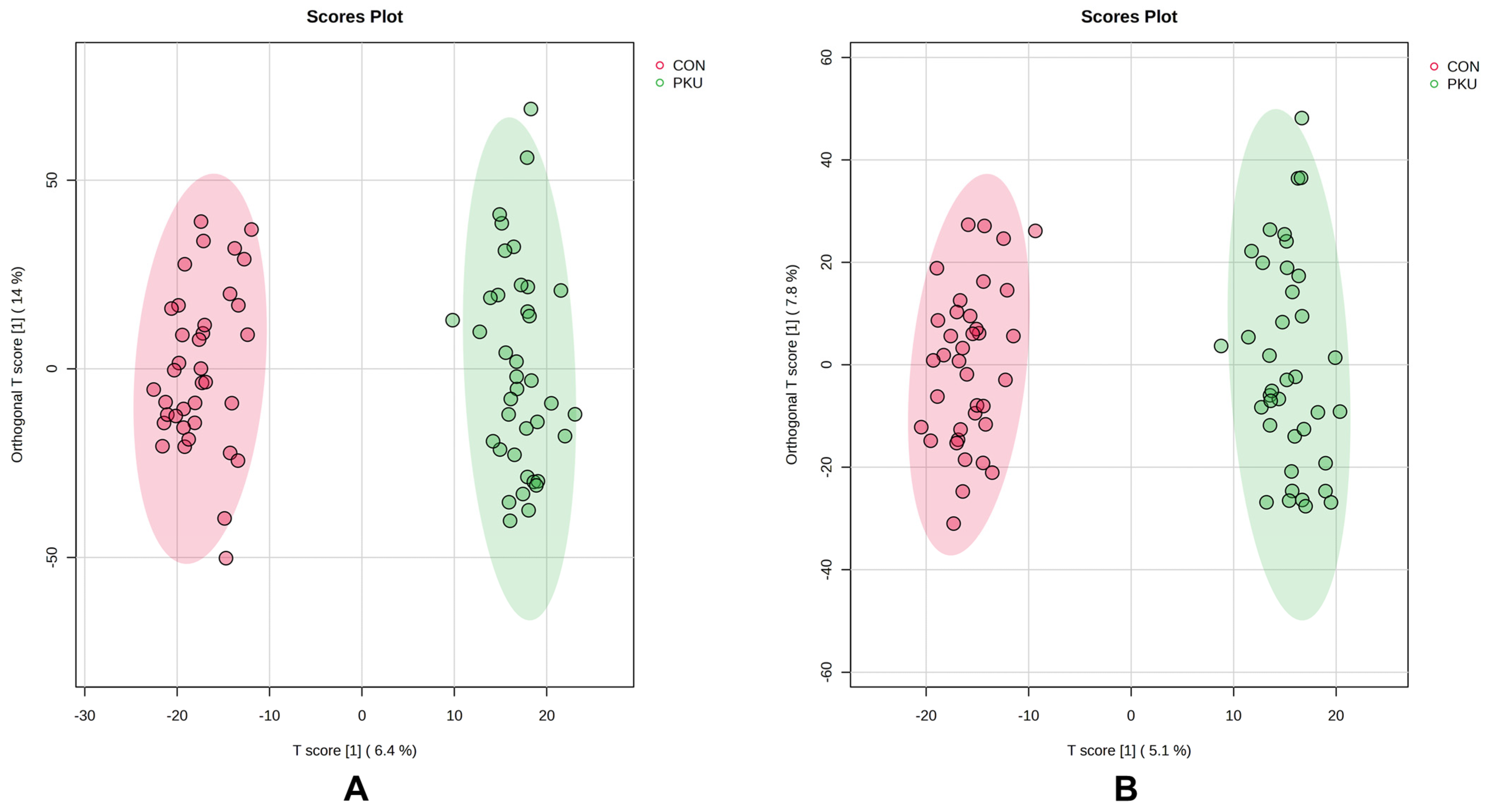 Figure 1. OPLS-DA scores plot of population samples in ESI+ (A) and ESI− (B). Red and green dots are the samples from healthy controls and individuals with PKU, respectively.