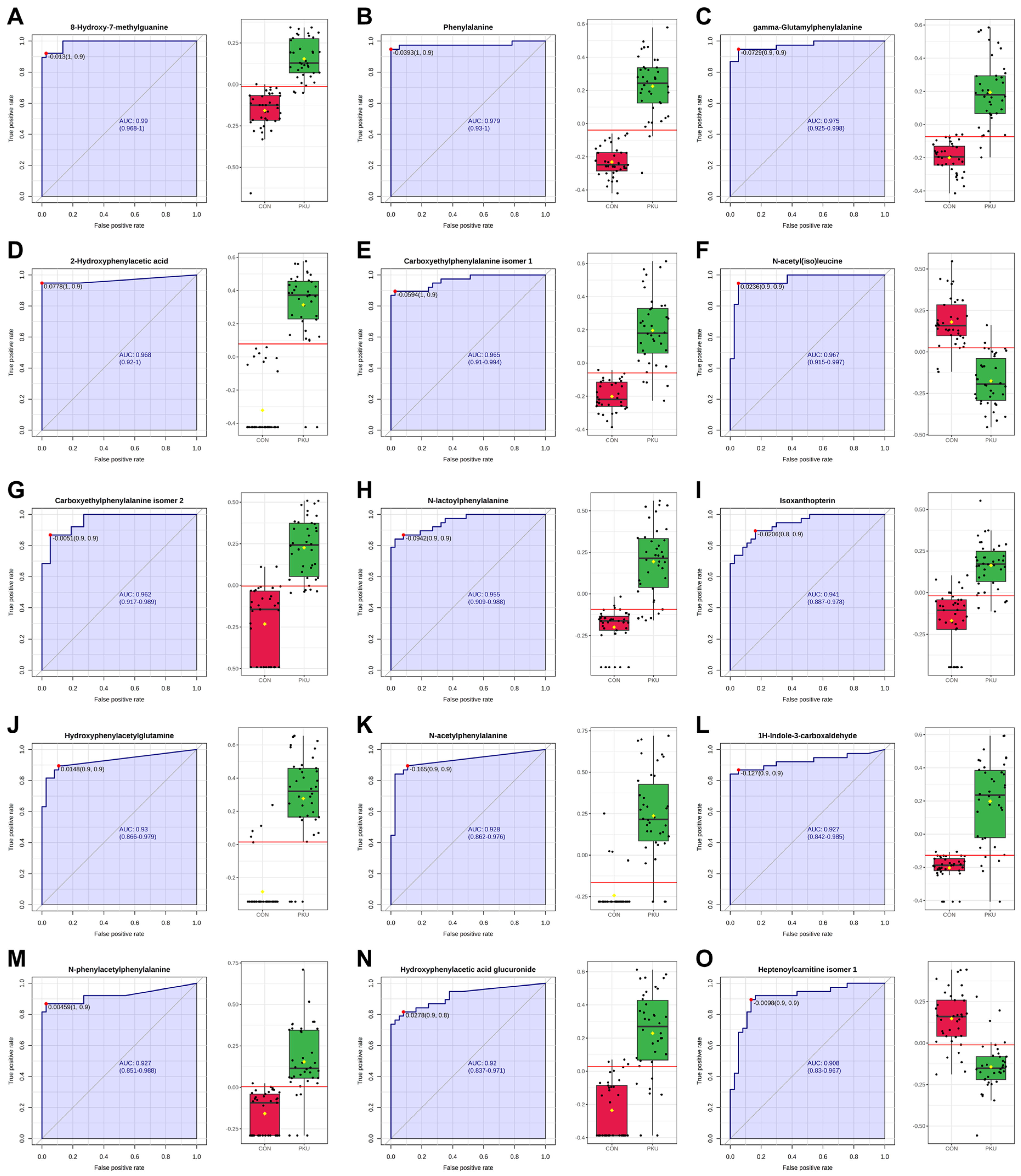 Figure 3. ROC analysis of potential biomarkers and normalized abundance in control (red) vs. PKU (green). Red dot and red line correspond to the optimal cutoff value of the ROC curve. Metabolites are sorted from the highest to the lowest AUC value. (A) M18, 8-hydroxy-7-methylguanine. (B) M01, phenylalanine. (C) M05, γ-Glutamylphenylalanine. (D) M02, 2-hydroxyphenylacetic acid. (E) M06, carboxyethylphenylalanine isomer 1. (F) M30, N-acetyl(iso)leucine. (G) M07, carboxyethylphenylalanine isomer 2. (H) M08, N-lactoylphenylalanine. (I) M19, isoxanthopterin. (J) M03, hydroxyphenylacetylglutamine. (K) M11, N-acetylphenylalanine. (L) M21, 1H-indole-3-carboxaldehyde. (M) M10, N-phenylacetylphenylalanine. (N) M04, hydroxyphenylacetic acid glucuronide. (O) M33, heptenoylcarnitine isomer 1.