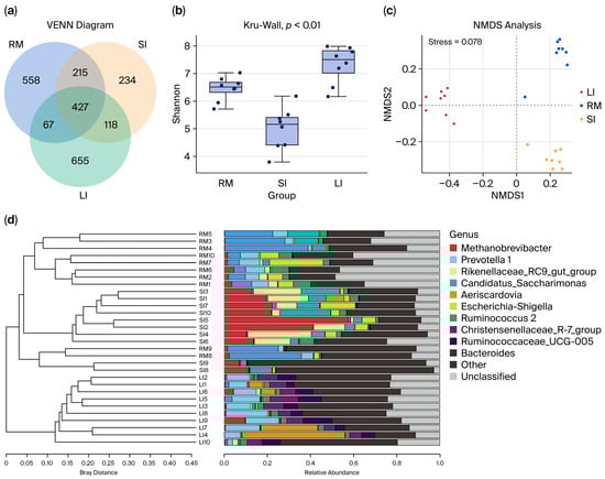 (a) Venn diagram and UpSet plot illustrating shared and unique bacterial operational taxonomic units (OTUs) among the rumen (RM), small intestine (SI), and large intestine (LI) chyme samples. (b) Shannon diversity index of bacterial communities in chyme samples from RM, SI, and LI. (c) Non-metric multidimensional scaling (NMDS) plot based on Bray–Curtis distance, showing the clustering patterns of microbial communities across the RM, SI, and LI. (d) Hierarchical tree illustrating the unweighted pair group method with arithmetic mean (UPGMA) clustering results based on microbial community composition in the three GI regions. In (b), dots indicate individual samples (Shannon diversity values) overlaid on the boxplots.