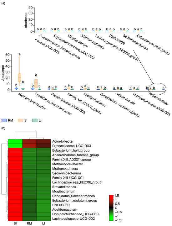 Overall, the relative abundance of several genera in the small intestine (SI) was significantly higher than in both the rumen (RM) and large intestine (LI). Additionally, certain genera, such as Prevotellaceae_UCG-003, which were relatively abundant in the rumen and large intestine, exhibited lower abundance in the small intestine, potentially reflecting their primary role in fiber degradation and fermentation processes [24].