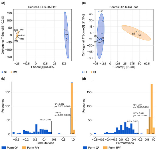 Orthogonal Partial Least Squares (OPLS) score plots and model validation results. (a) “SI vs. RM” score plot showing sample separation; (b) permutation/cross-validation results for the “SI vs. RM” model. (c) “LI vs. SI” score plot showing sample separation; (d) permutation/cross-validation results for the “LI vs. SI” model.
