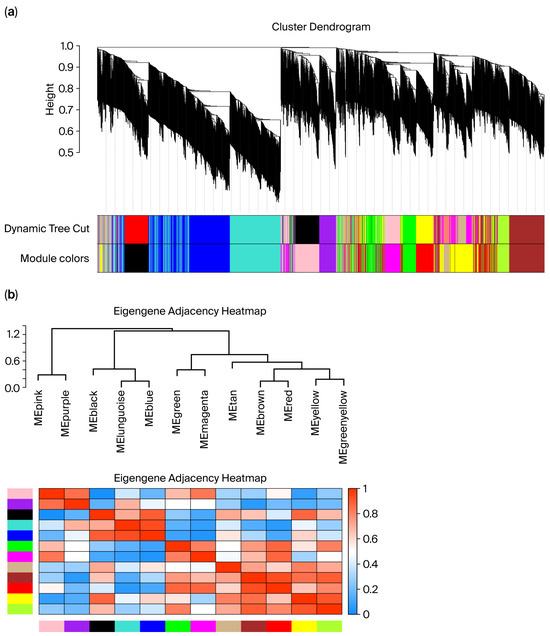 (a) Sample clustering relationship diagram; (b) module generation plot. In panel (a), the different colors under the dendrogram represent distinct co-expression modules identified by WGCNA. In panel (b), the color scale from blue to red indicates the eigengene adjacency (correlation) between modules, with blue representing low adjacency and red representing high adjacency.