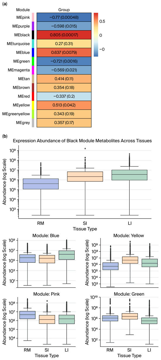 (a) Module–group correlation p-value plot (rows represent module eigengene (ME), and columns represent “group” for each intestinal segment: RM, SI, and LI), where each cell shows the correlation and p-value, (the table is color-coded by correlation). (b) Expression abundance of metabolite modules across gastrointestinal tissues (RM, SI, and LI) in Qianqiu goats. (Box plots show the distribution of metabolite abundances across the three intestinal segments (RM, SI, LI) for modules that are significantly associated with tissue type). In panel (a), the colors on the left indicate the different WGCNA modules (MEpink, MEpurple, MEblack, etc.), and the color scale in the heatmap (from blue to red) shows the strength and direction of the correlation between each module and group (blue = negative, red = positive). In panel (b), the colors of the box plots correspond to the different tissue types as indicated in the legend, and the dots represent the individual sample values (outliers) within each group.
