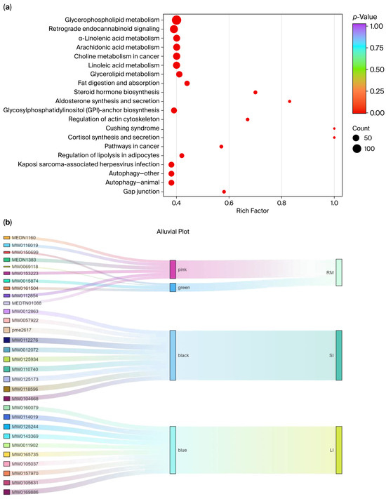 (a) KEGG pathway enrichment analysis; (b) Sankey visualization of the three-layer tissue–module–metabolite structure. Each ribbon links an individual metabolite (left, labeled by Metabolite_ID) to its WGCNA module (middle, colored “pink/green/black/blue”) and to associated intestinal tissue (right, RM; SI; LI).