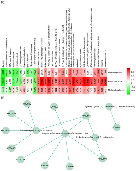 (a) Spearman correlation analysis of key metabolites and microbial abundance. (b) Metabolic pathway network of key metabolites associated with microbial abundance.