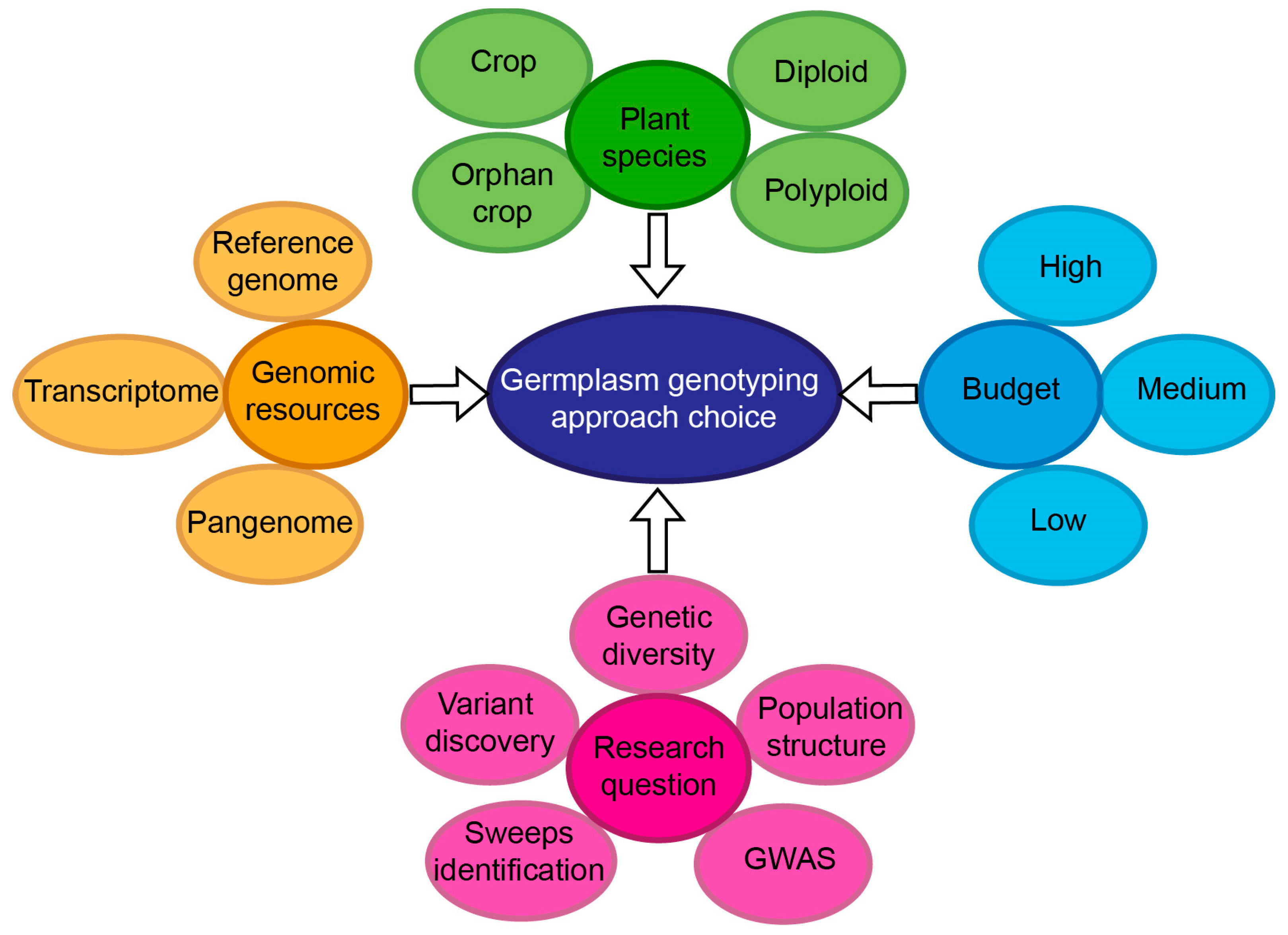 | WGRS | Low-coverage-Illumina based Long-read-sequencing based | Millions to hundreds of millions of SNPs | SNPs InDels CNV SVs PAV | Yes | Discovery of various types of polymorphism (SNPs, InDels, CNV, SVs). Survey of polymorphism across the whole genome. | Requires a reference genome sequence (or transcriptome). Demands specialised bioinformatic skills. More expensive compared to RRS and SNP arrays. |