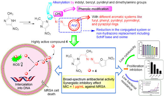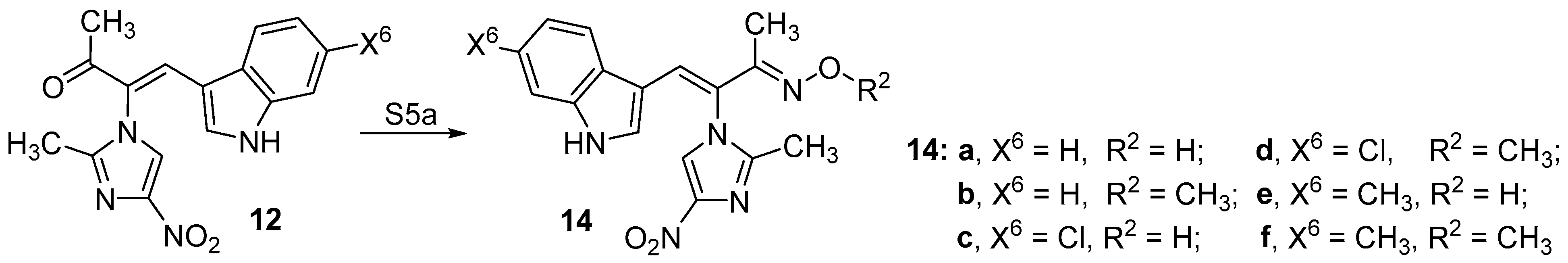 - Li, Z.Z.; Tangadanchu, V.K.R.; Battini, N.; Bheemanaboina, R.R.Y.; Zang, Z.L.; Zhang, S.L.; Zhou, C.H. Indole-nitroimidazole conjugates as efficient manipulators to decrease the genes expression of methicillin-resistant Staphylococcus aureus. Eur. J. Med. Chem. 2019, 179, 723–735. [Google Scholar] [CrossRef]