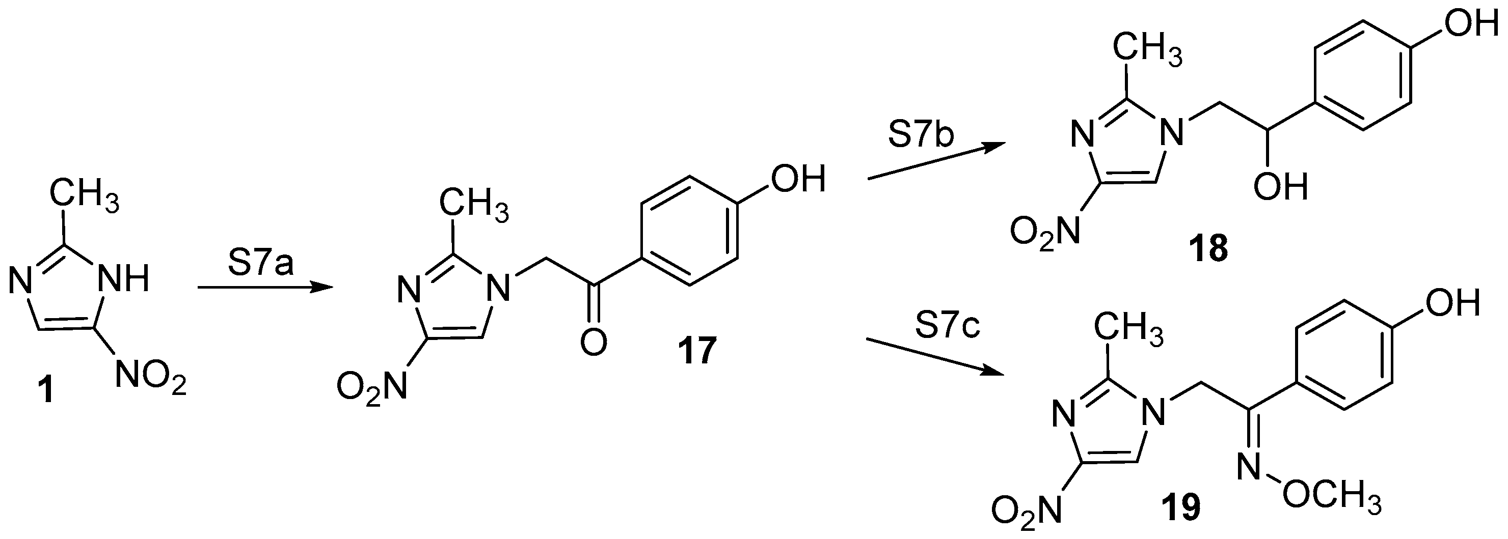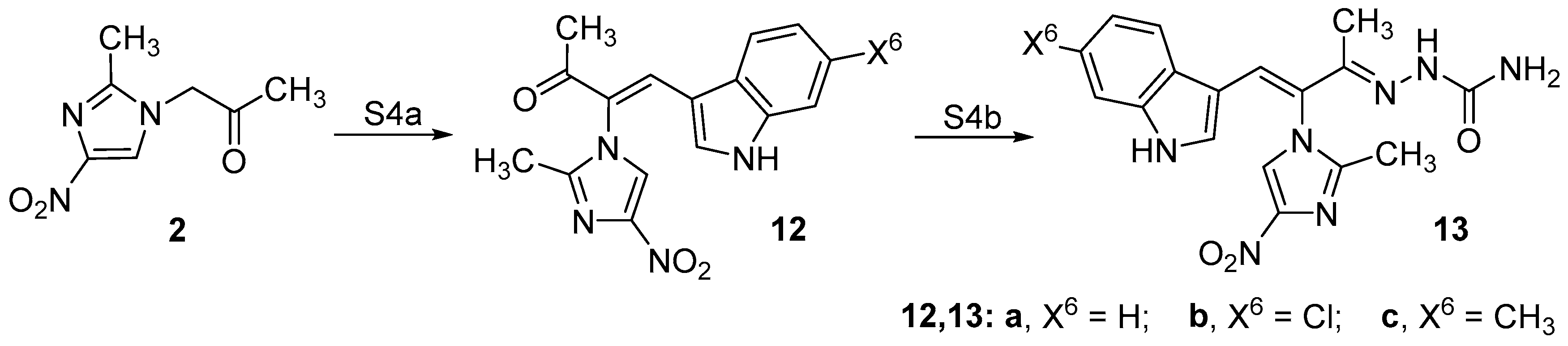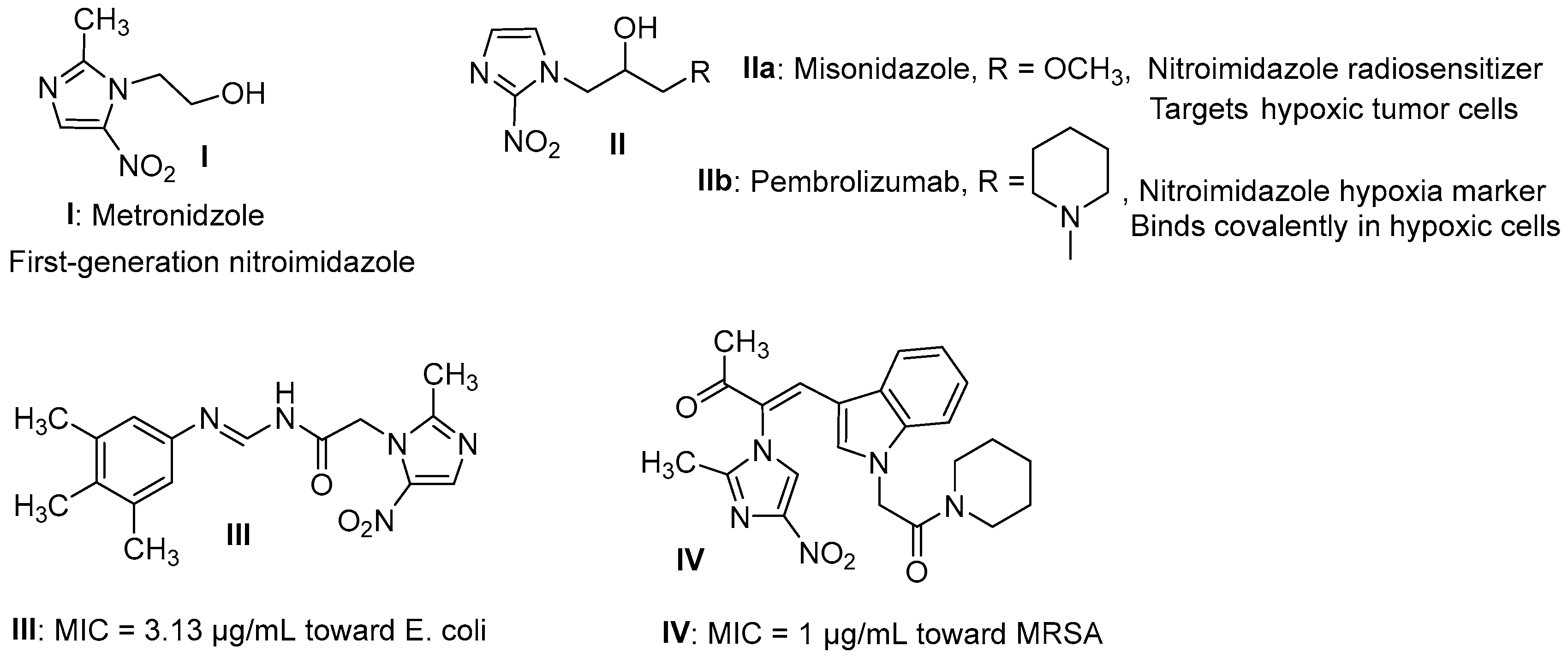 - Li, Z.Z.; Maddili, S.K.; Tangadanchu, V.K.R.; Bheemanaboina, R.R.Y.; Lin, J.M.; Yang, R.G.; Cai, G.X.; Zhou, C.H. Researches and applications of nitroimidazole heterocycles in medicinal chemistry. Sci. Sin. Chim. 2019, 49, 230–255. [Google Scholar] [CrossRef]