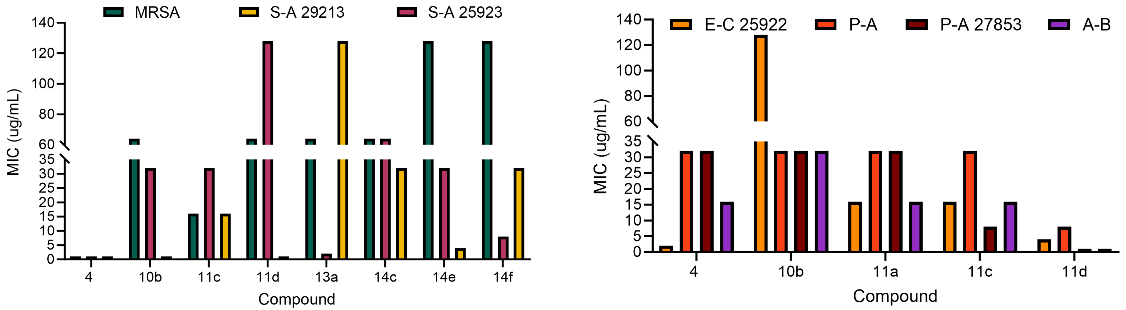 - Gehrmann, R.; Hertlein, T.; Hopke, E.; Ohlsen, K.; Lalk, M.; Hilgeroth, A. Novel small-molecule hybrid-antibacterial agents against S. aureus and MRSA strains. Molecules 2021, 27, 61. [Google Scholar] [CrossRef]