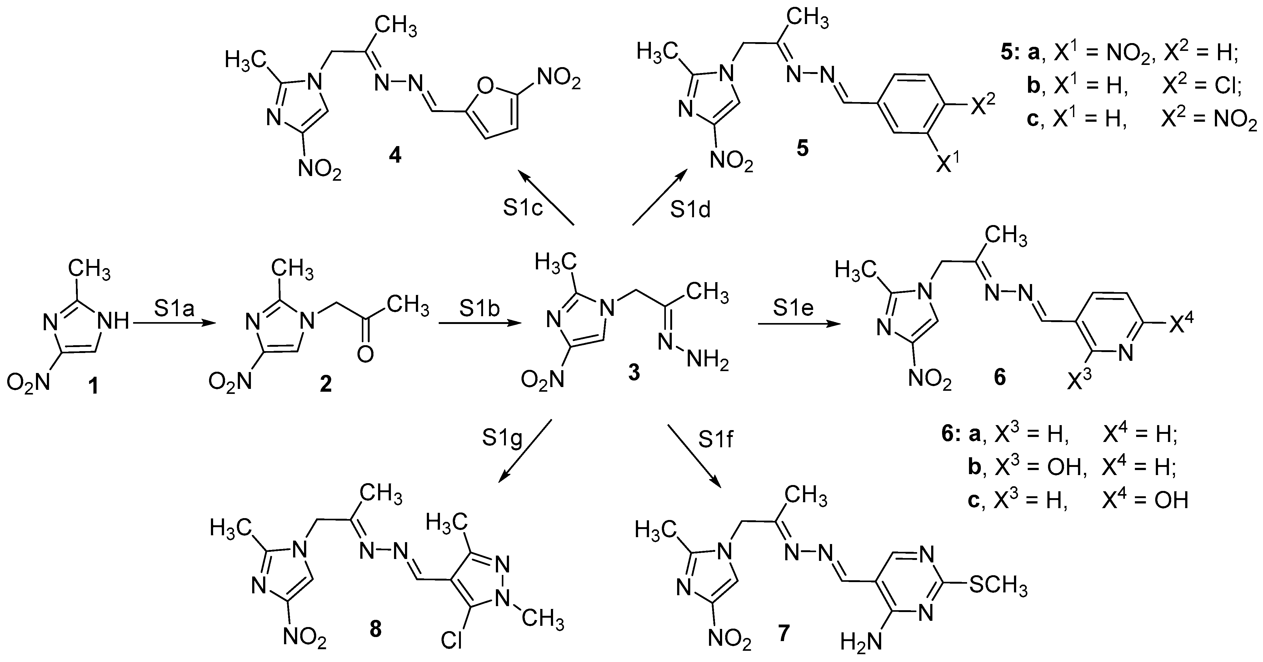 - Li, Y.; Zhao, C.P.; Ma, H.P.; Zhao, M.Y.; Xue, Y.R.; Wang, X.M.; Zhu, H.L. Design, synthesis and antimicrobial activities evaluation of Schiff base derived from secnidazole derivatives as potential FabH inhibitors. Bioorg Med. Chem. 2013, 21, 3120–3126. [Google Scholar] [CrossRef] [PubMed]